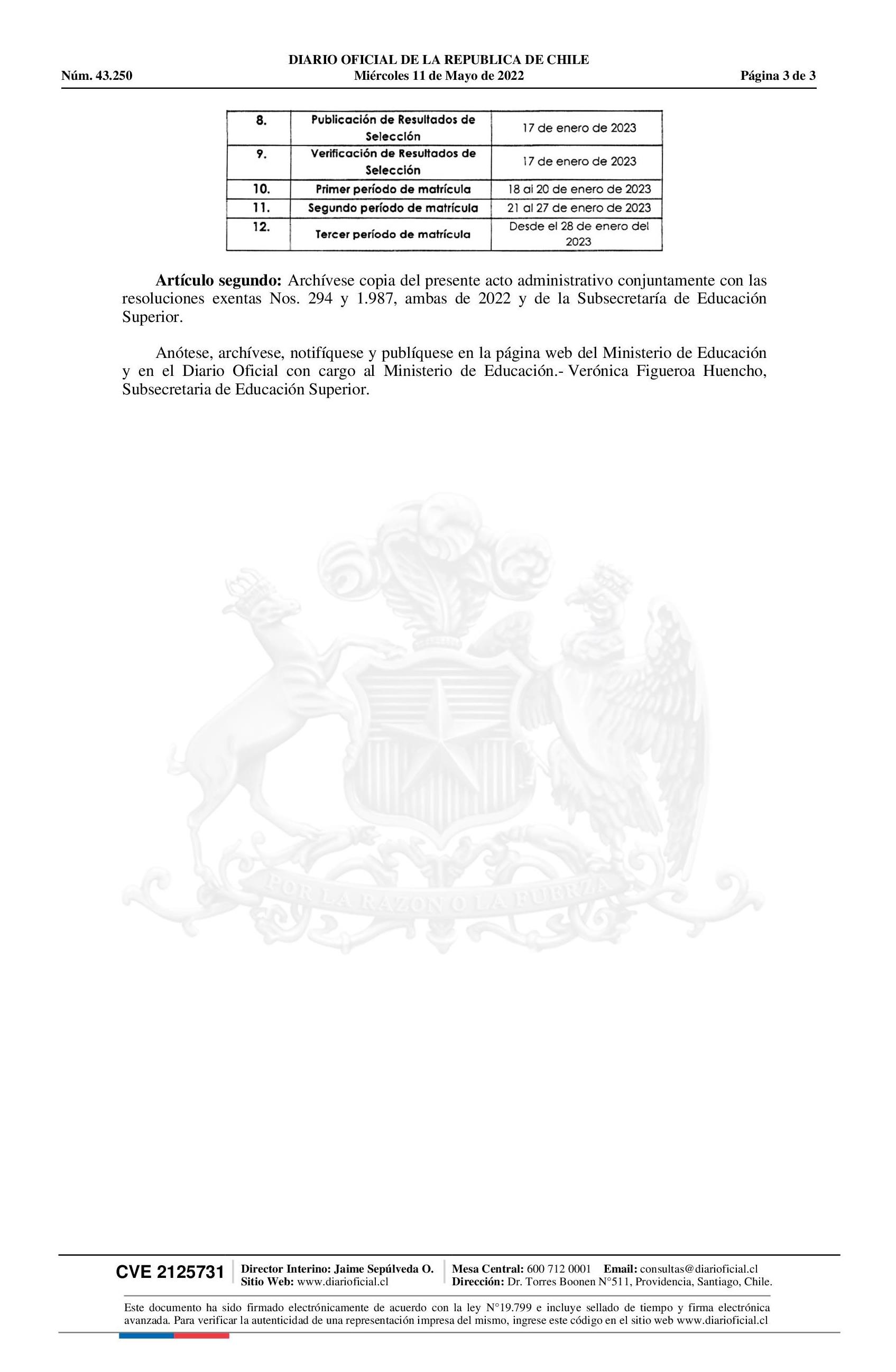 | Título: | Ministerio de Educación Establece Calendario de Fechas Relevantes de la Prueba de Admisión Universitaria En Su Aplicación Regular, Y de Los Procesos de Postulación Centralizada, Resultados de Selección Y de Matrícula, Correspondiente Al Proceso de Admisión 2023 |