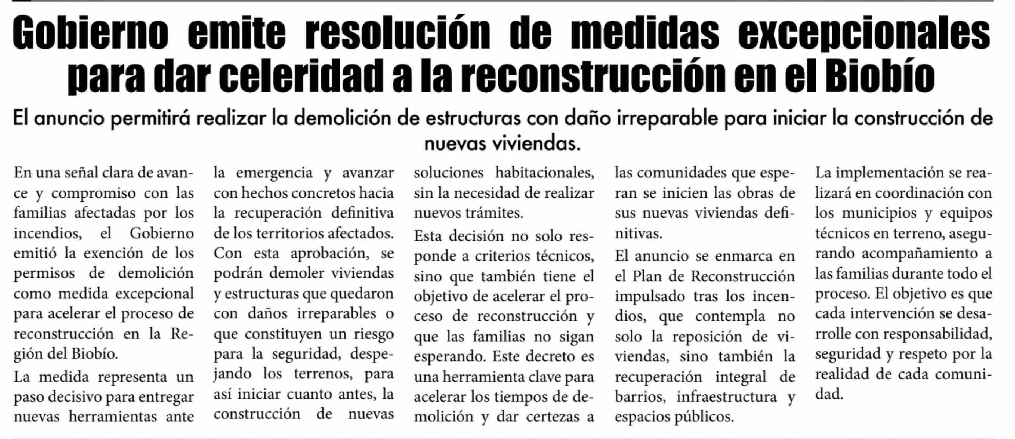 | Título: | Gobierno emite resolución de medidas excepcionales para dar celeridad a la reconstrucción en el Biobio |