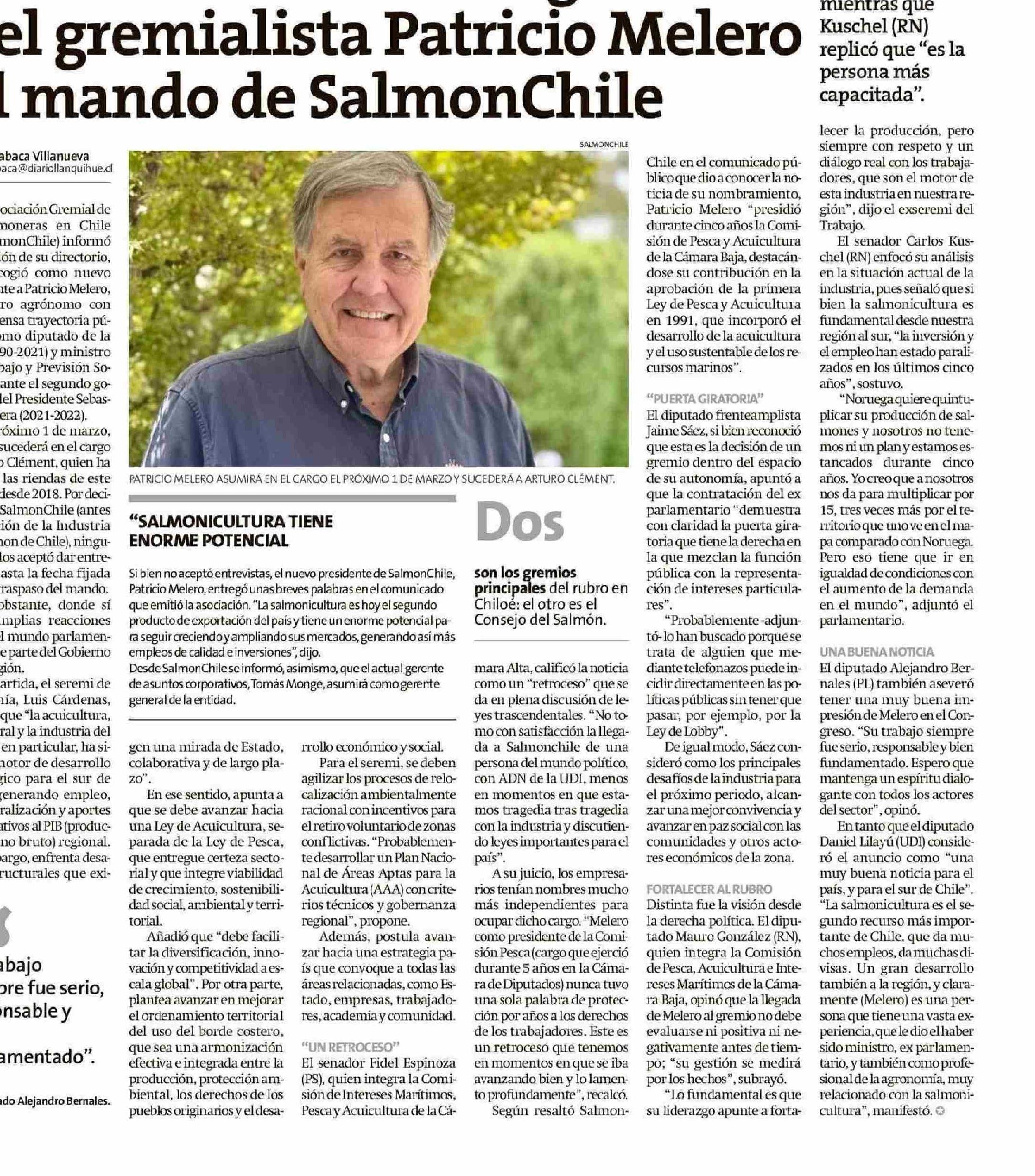 Encontradas reacciones políticas causa la designación del gremialista Patricio Melero al mando de SalmonChile 28-01-2026 La Estrella de Chiloé |