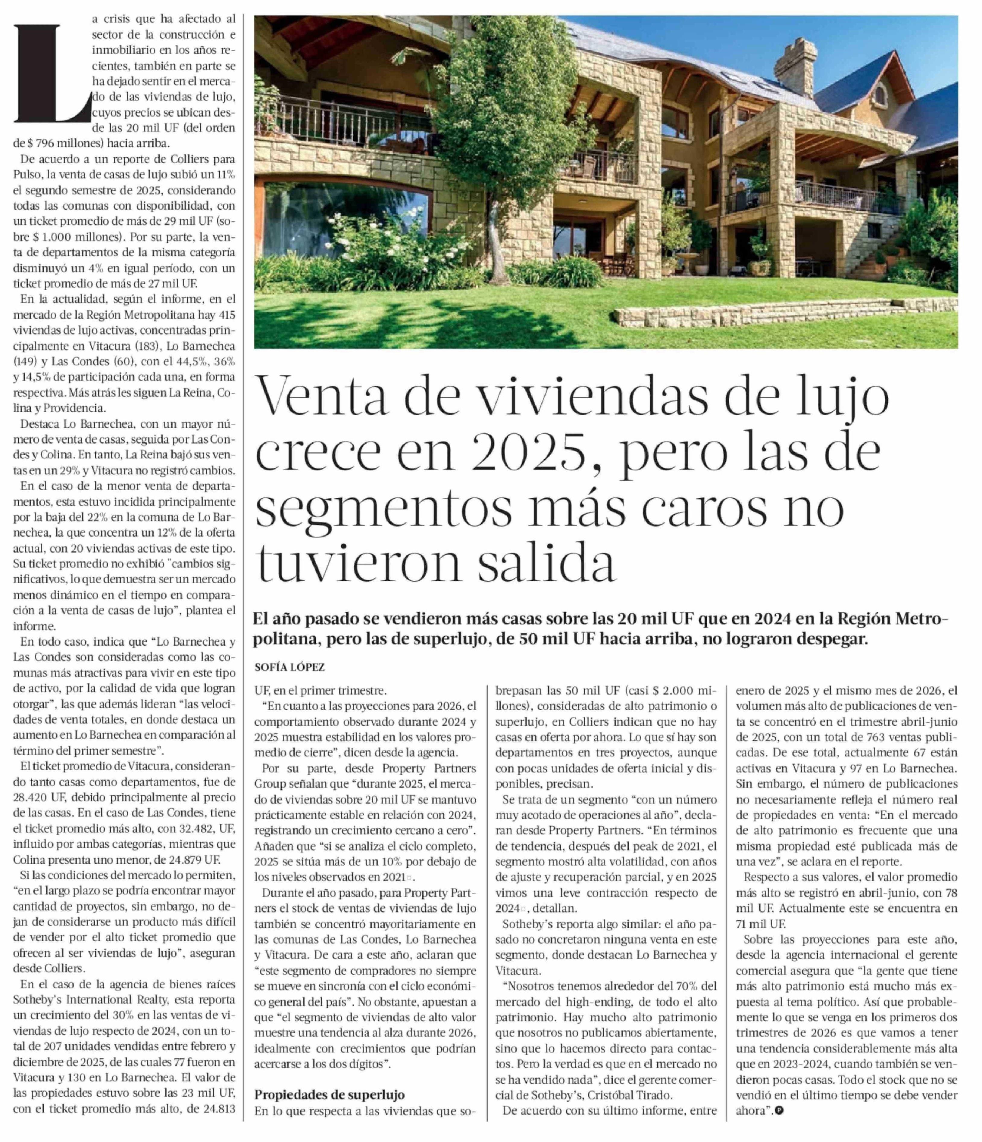 Venta de viviendas de lujo crece en 2025, pero las de segmentos más caros no tuvieron salida 21-02-2026 La Tercera |