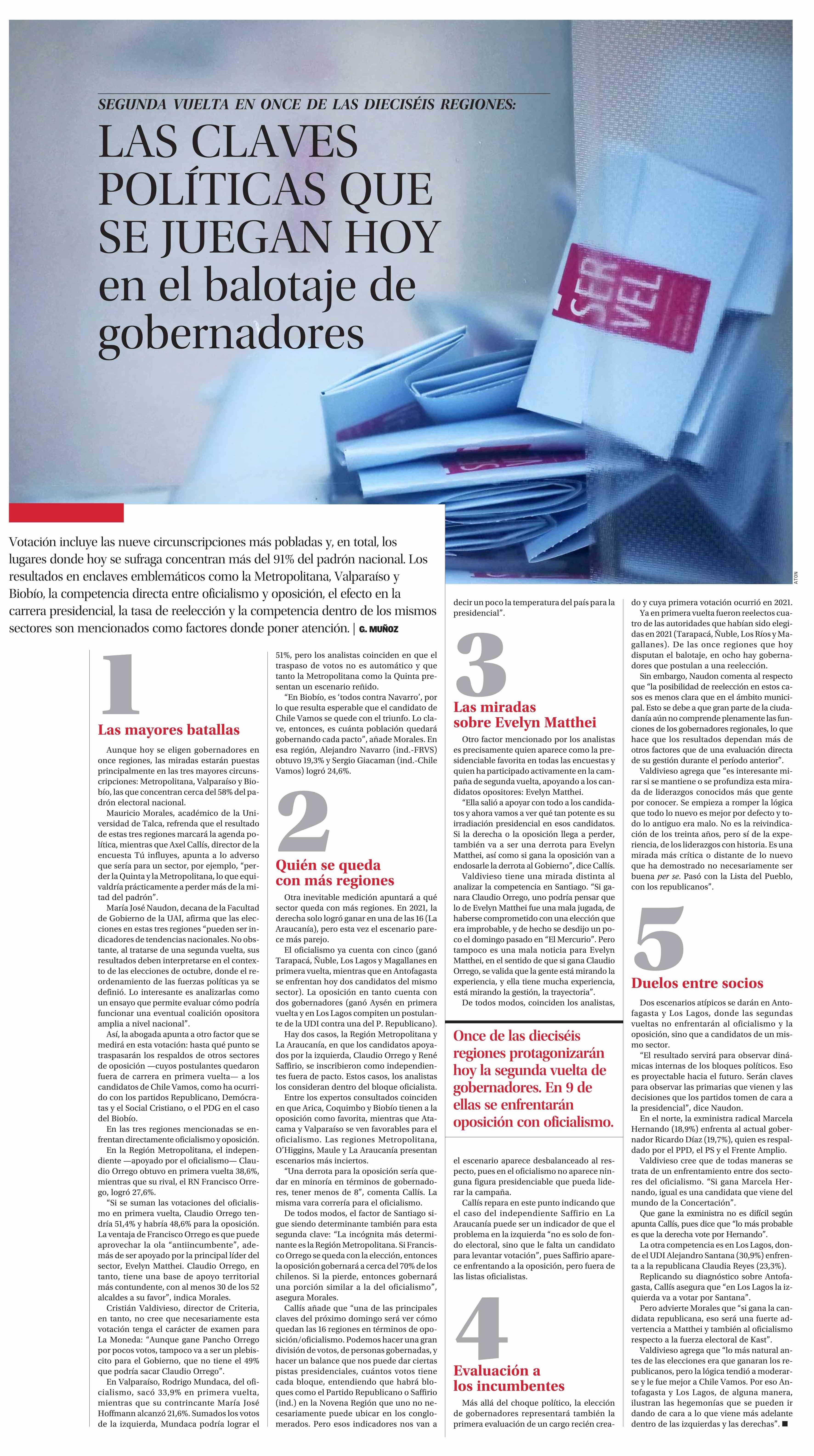 LAS CLAVES POLÍTICAS QUE SE JUEGAN HOY en el balotaje de gobernadores 24-11-2024 El Mercurio |