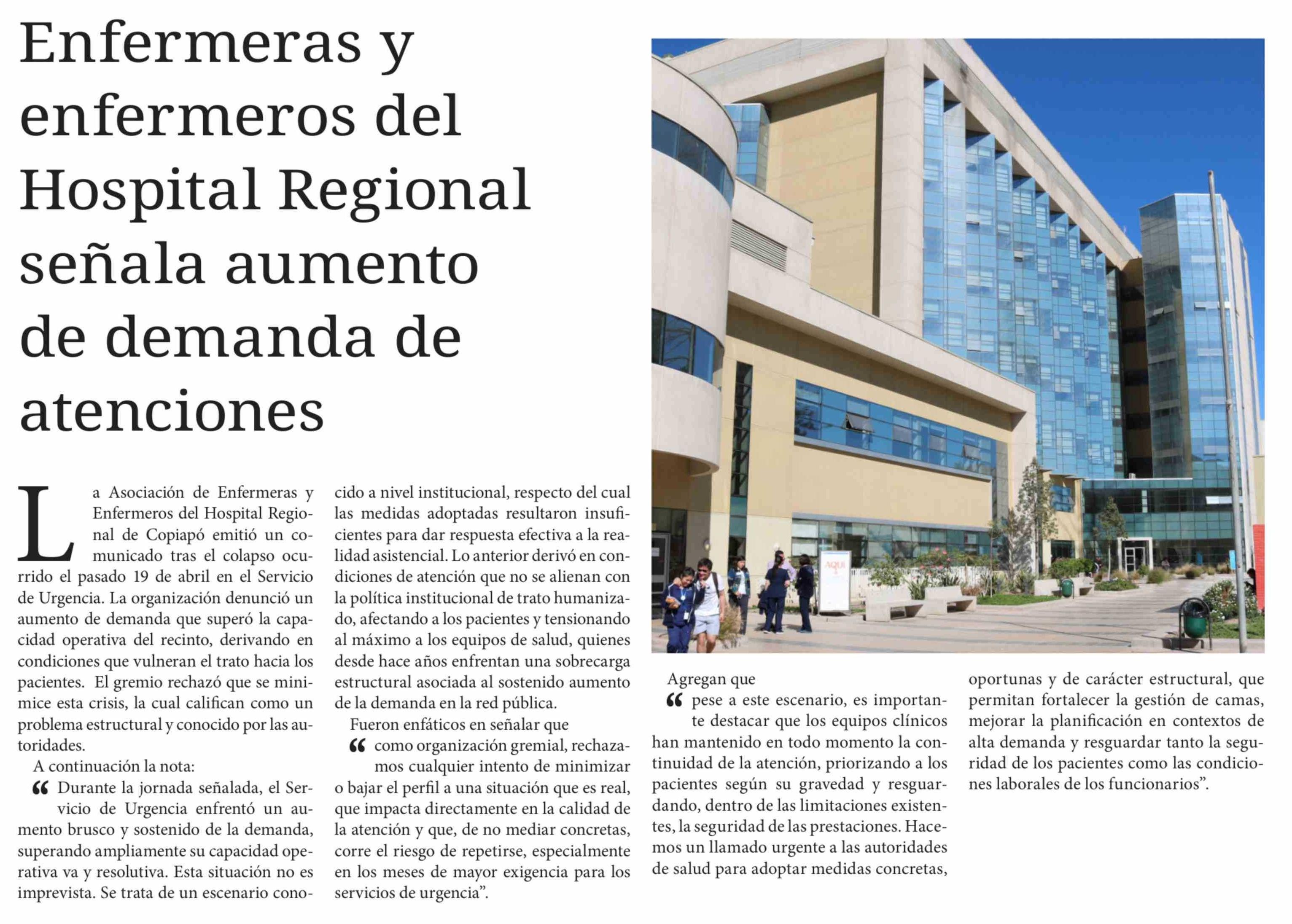 Enfermeras y enfermeros del Hospital Regional señala aumento de demanda de atenciones 22-04-2026 Diario Chañarcillo |