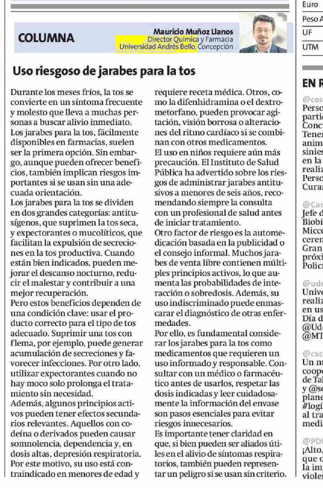 Columnas de Opinión: Uso riesgoso de jarabes para la tos 06-06-2025 La Estrella de Concepción |