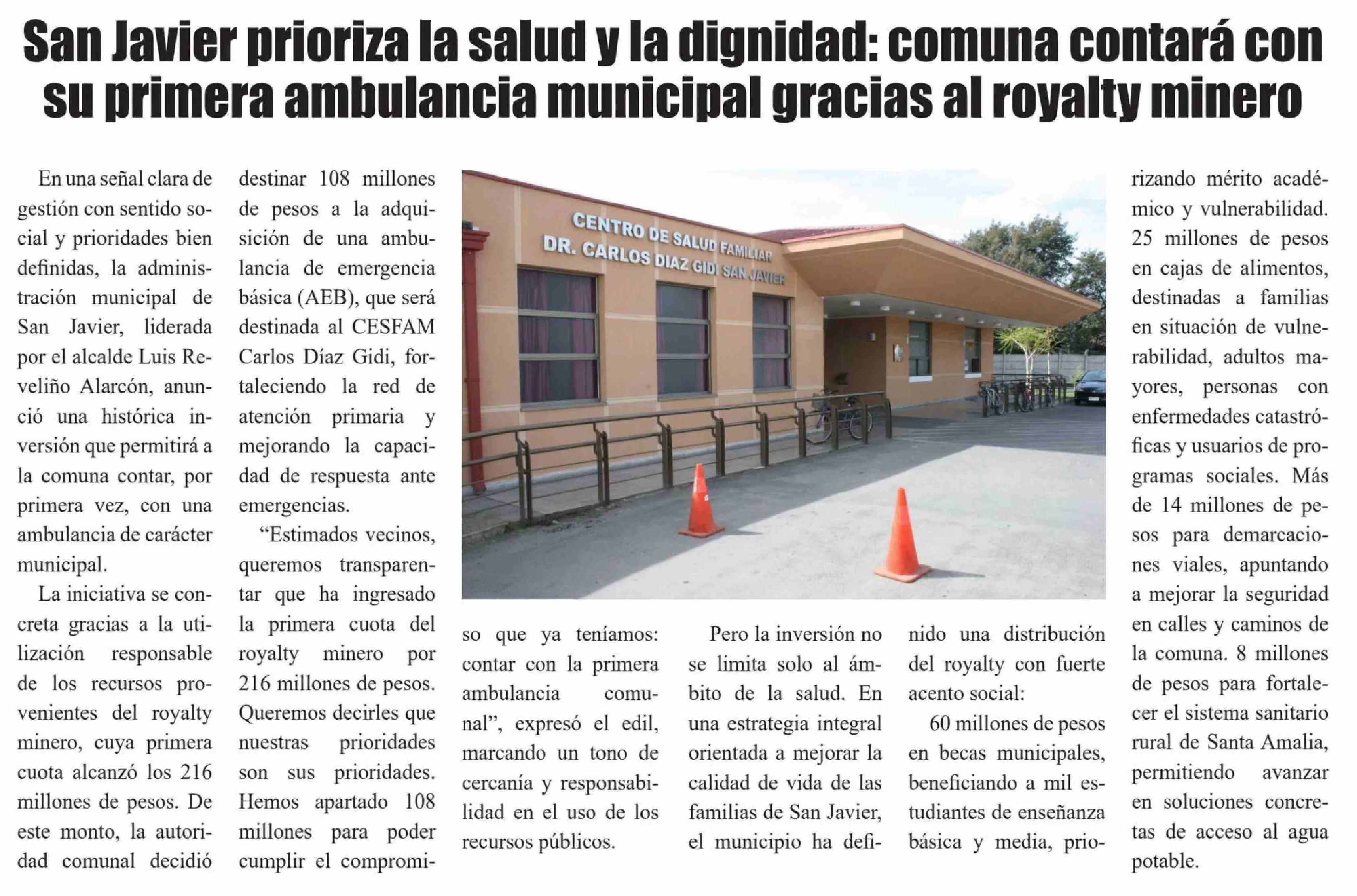 Título: San Javier prioriza la salud y la dignidad: comuna contará con su primera ambulancia municipal gracias al royalty minero