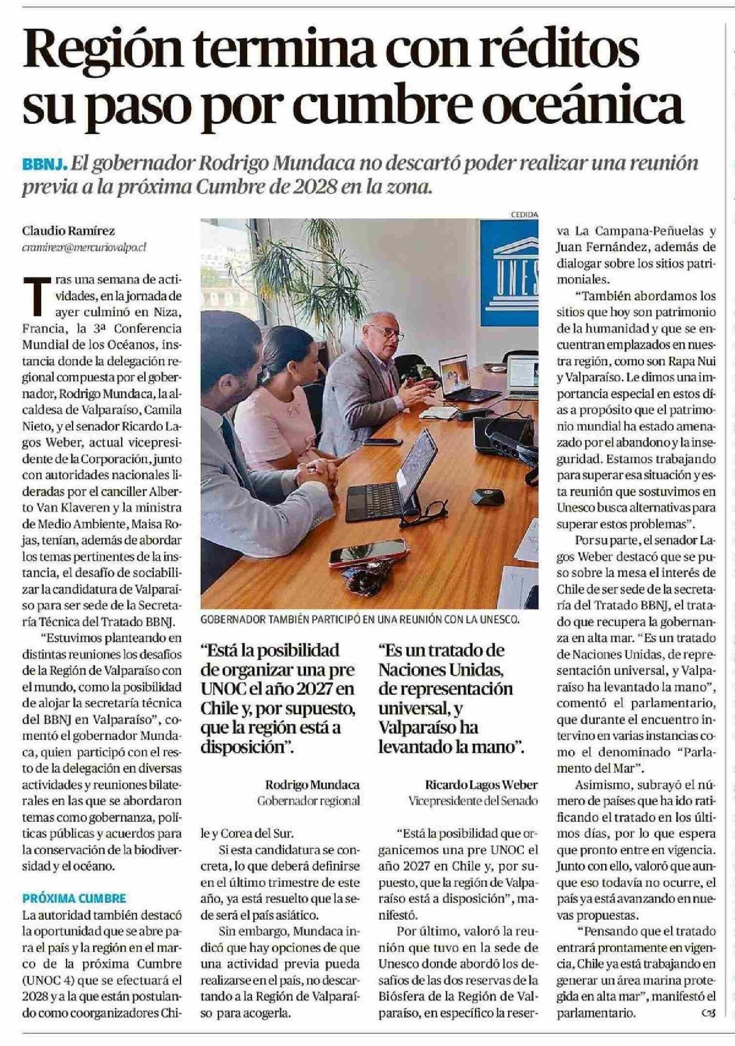 Región termina con réditos su paso por cumbre oceánica 14-06-2025 El Mercurio de Valparaíso |