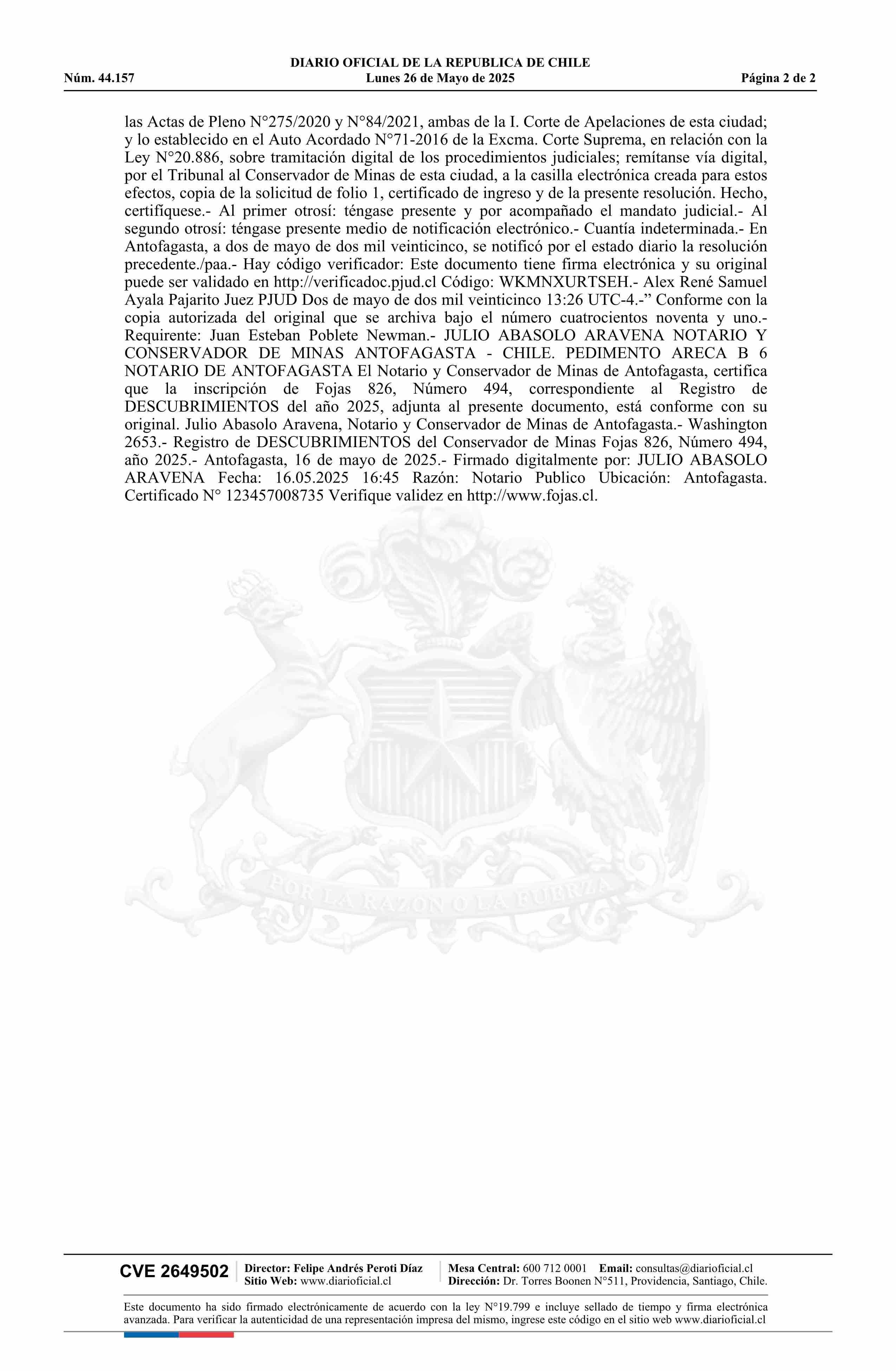 ARECA B 6 / Antofagasta Minerals S.A. 26-05-2025 DIARIO OFICIAL CHILE - BOLETÍN OFICIAL DE MINERÍA |