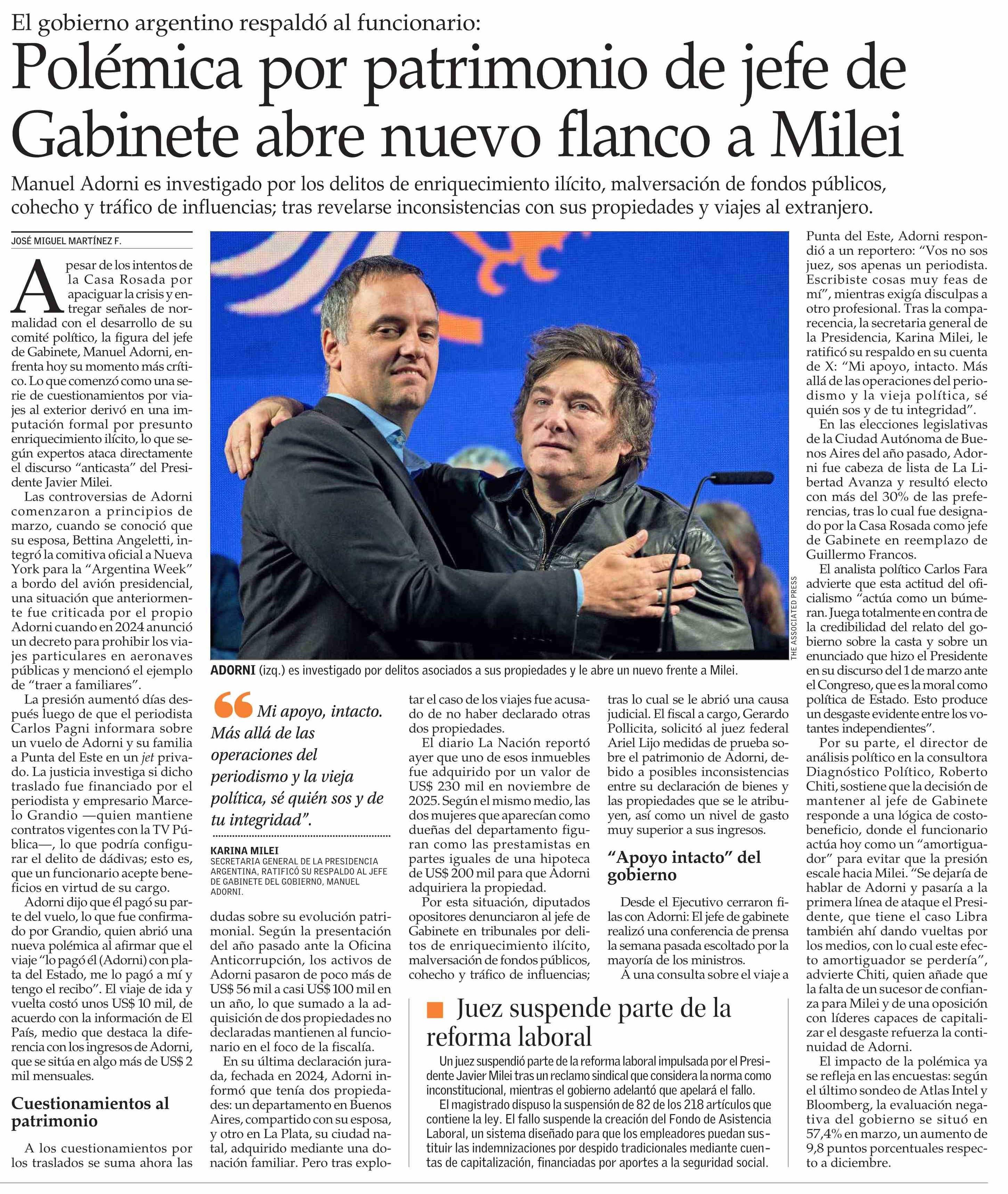 Polémica por patrimonio de jefe de Gabinete abre nuevo flanco a Milei 31-03-2026 El Mercurio |