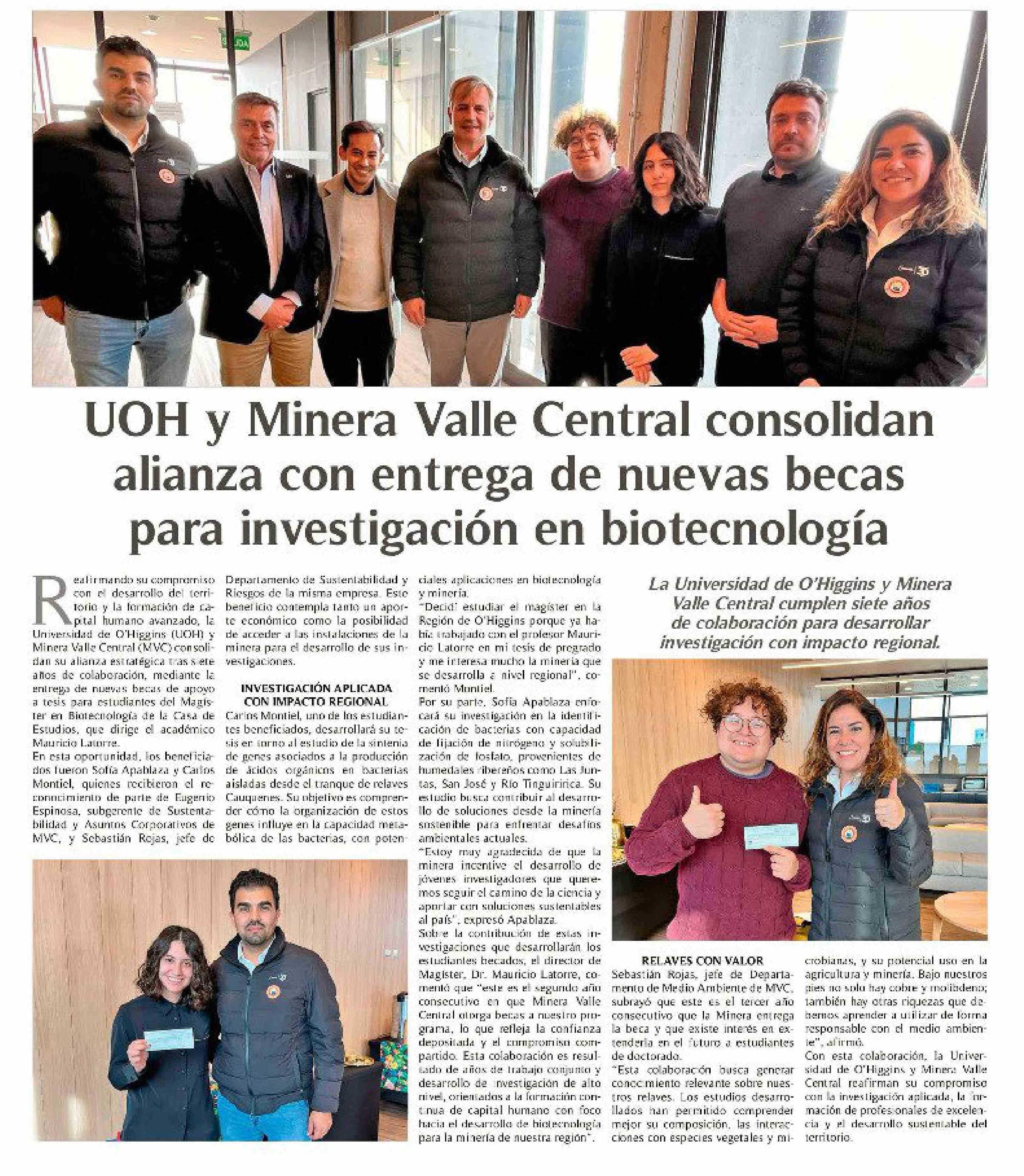 UOH y Minera Valle Central consolidan alianza con entrega de nuevas becas para investigación en biotecnología 30-05-2025 El Rancagüino |