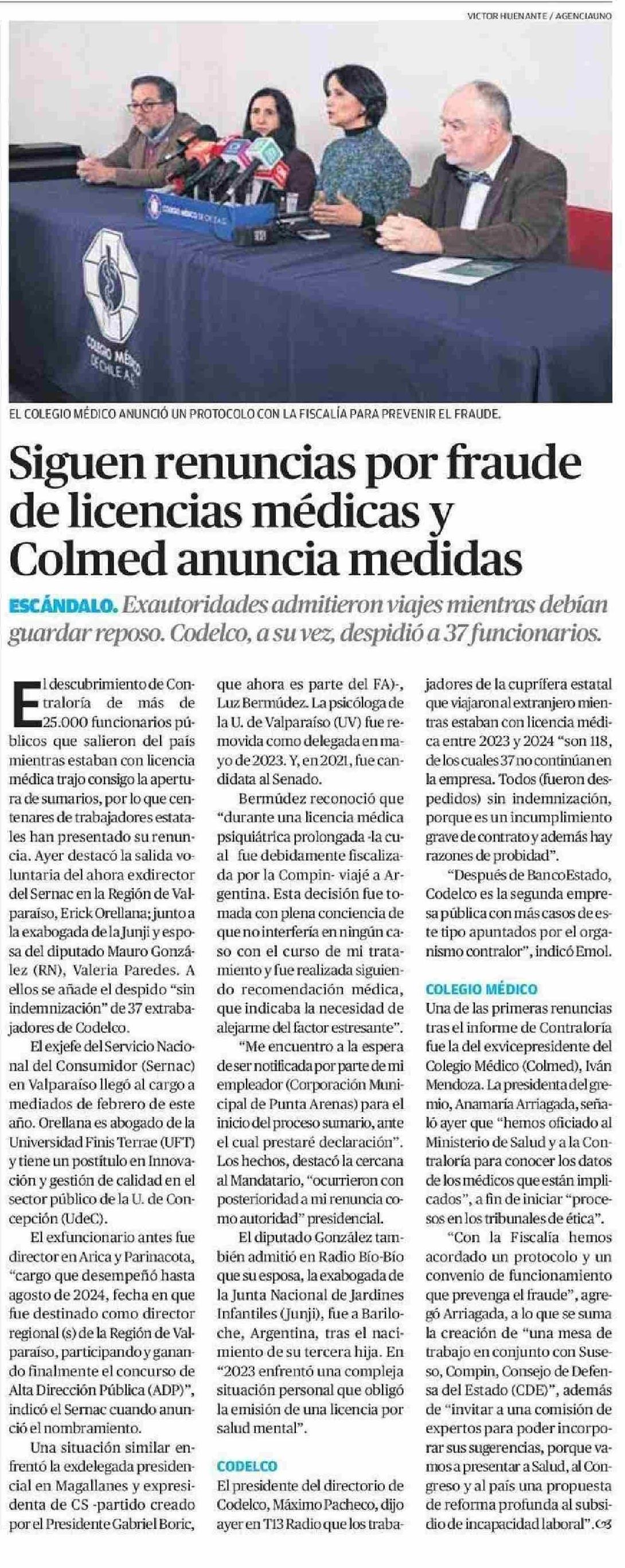 Siguen renuncias por fraude de licencias médicas y Colmed anuncia medidas 30-05-2025 El Mercurio de Calama |