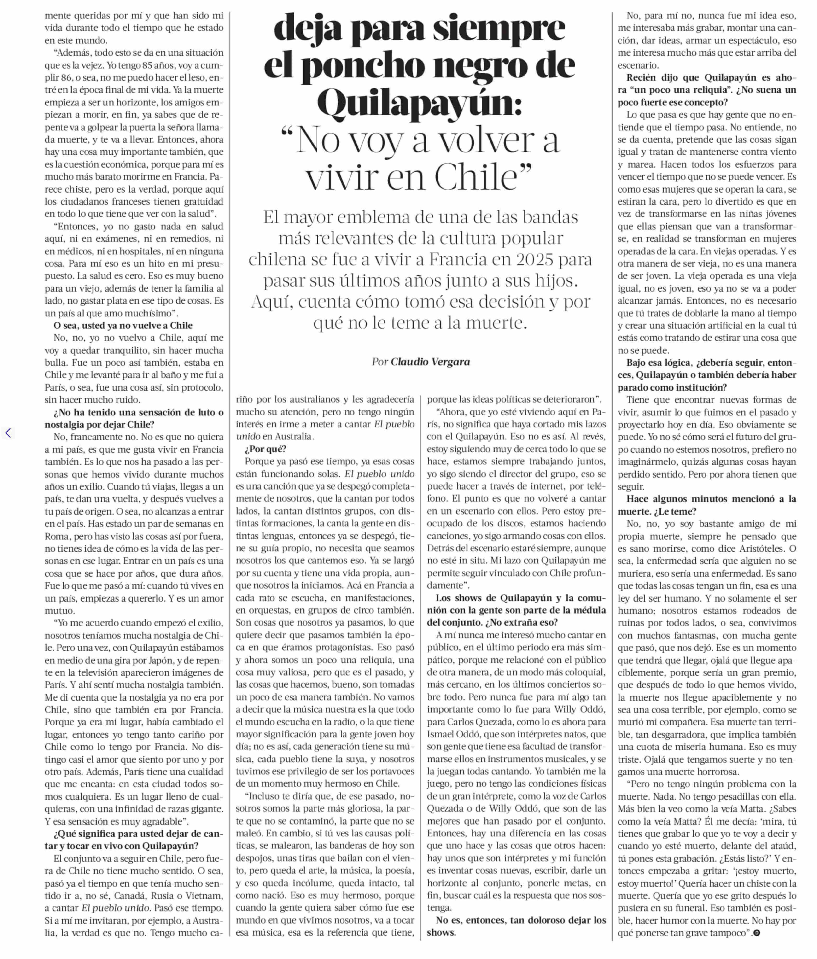 | Título: | Deja para siempre el poncho negro de Quilapayún: "No voy a volver a vivir en Chile" |