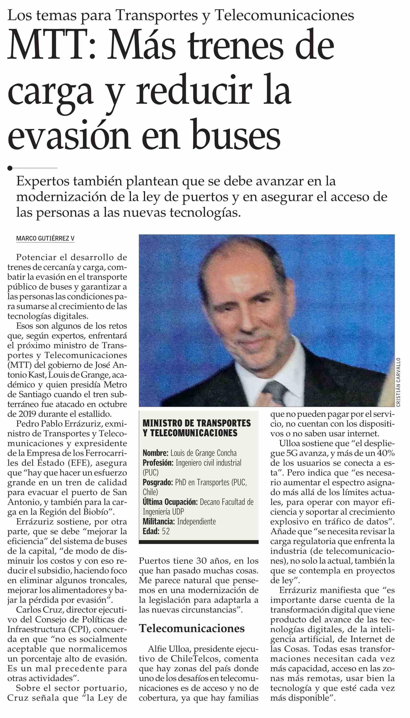 Título: MTT: Más trenes de carga y reducir la evasión en buses