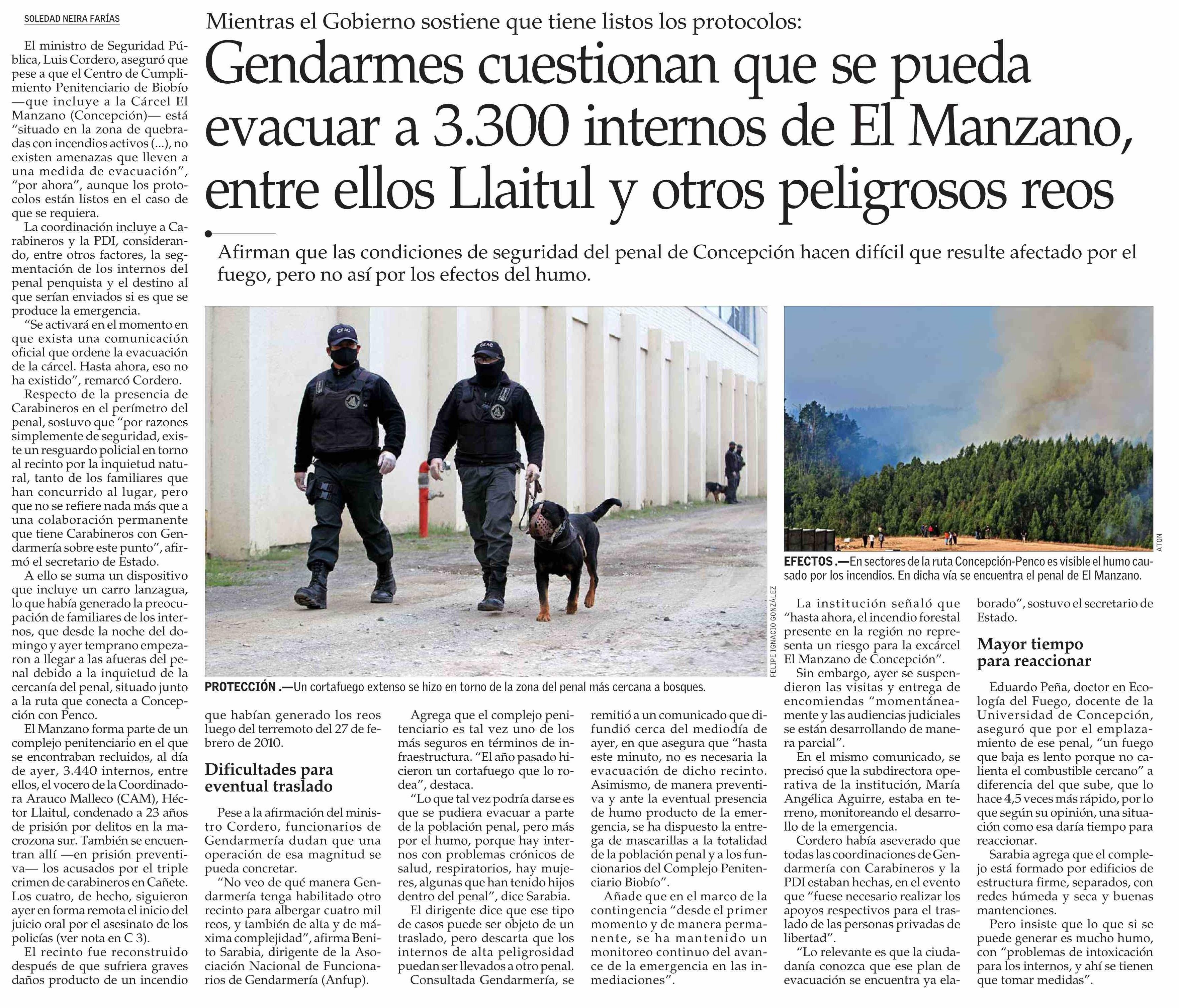 Título: Gendarmes cuestionan que se pueda evacuar a 3.300 internos de El Manzano, entre ellos Llaitul y otros peligrosos reos