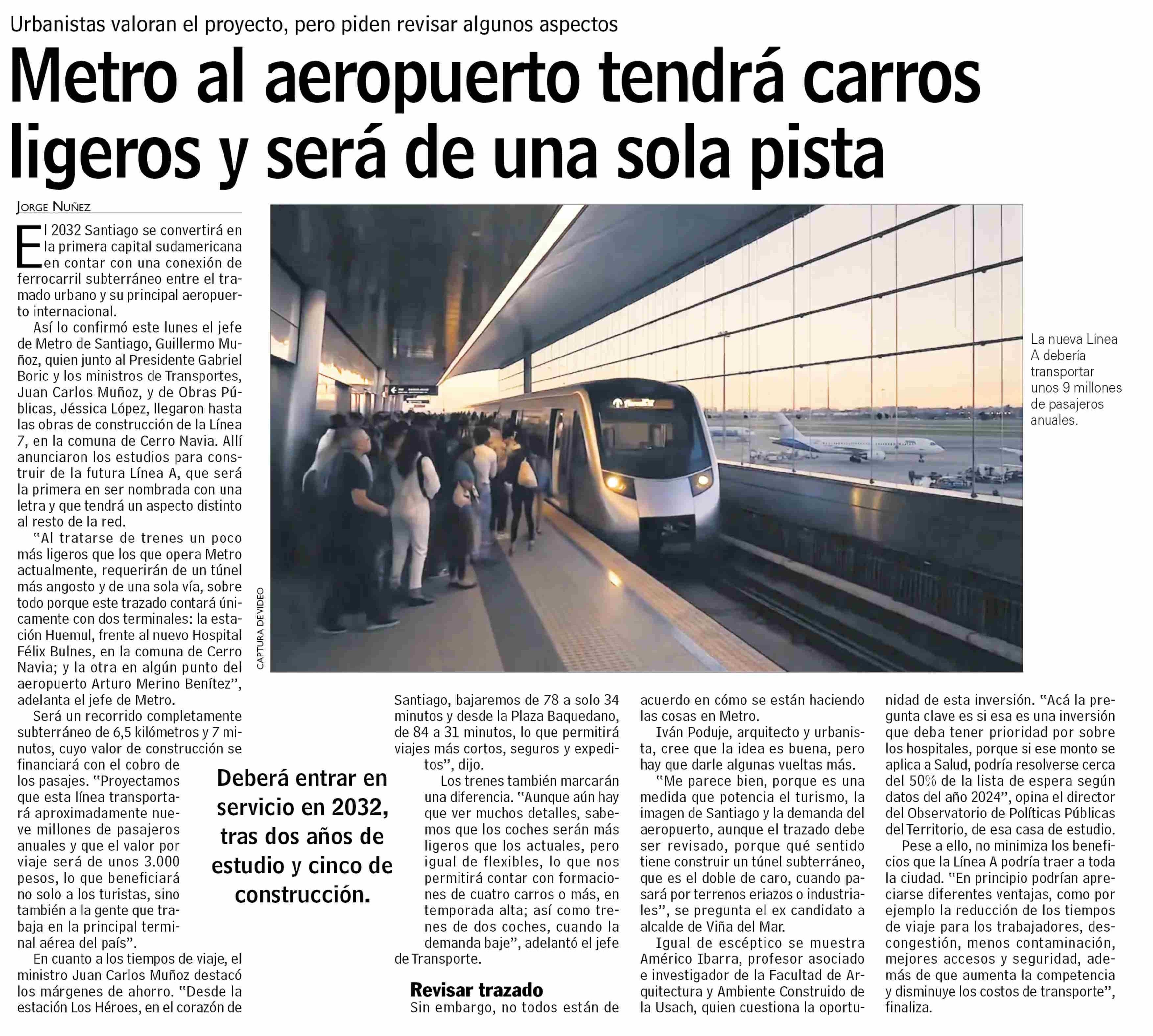 Metro al aeropuerto tendrá carros ligeros y será de una sola pista 03-06-2025 Las Últimas Noticias |