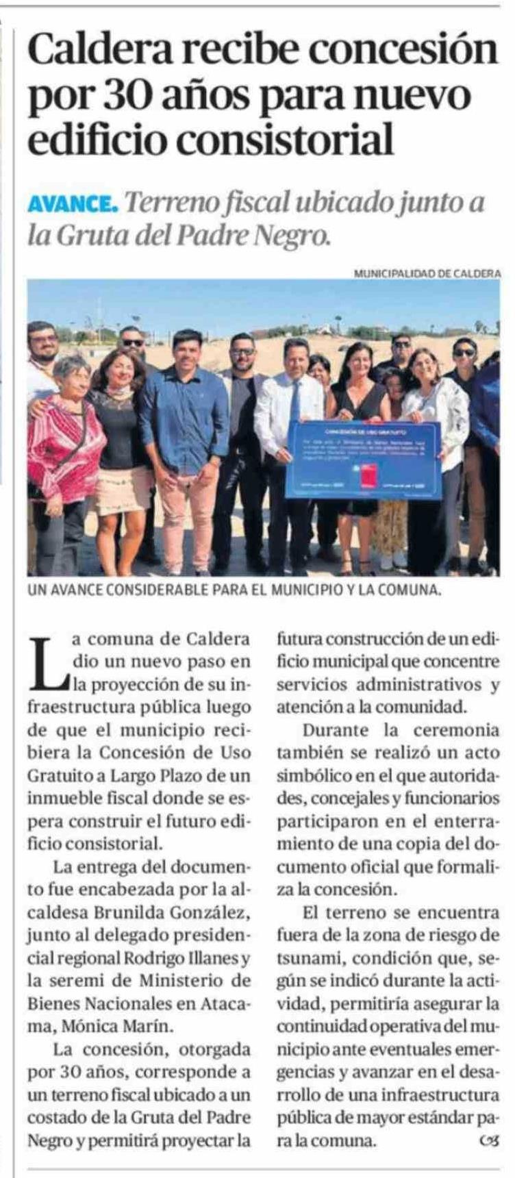 Título: Caldera recibe concesión por 30 años para nuevo edificio consistorial