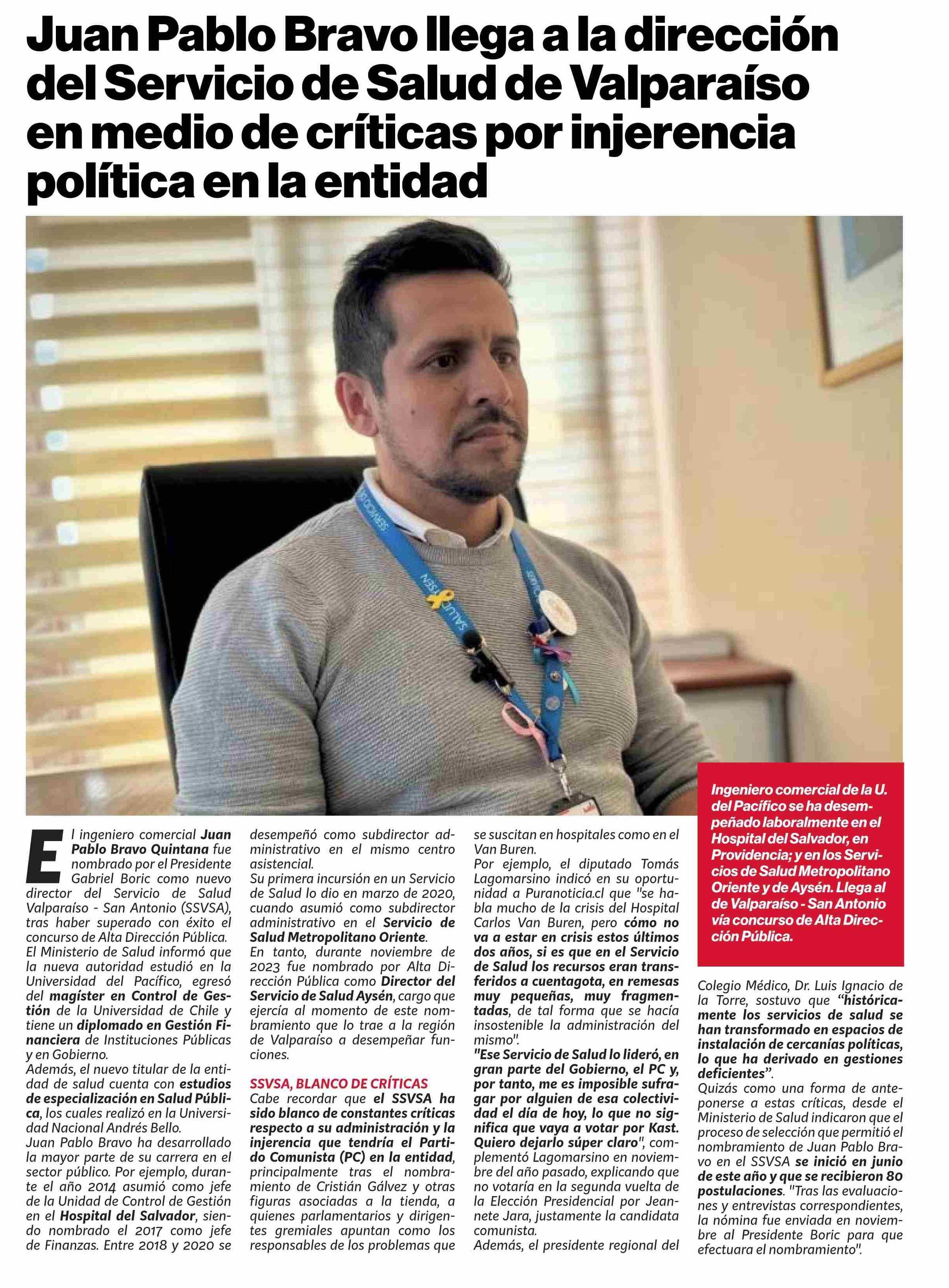 Juan Pablo Bravo llega a la dirección del Servicio de Salud de Valparaíso en medio de críticas por injerencia política en la entidad 08-01-2026 Puranoticia.cl |