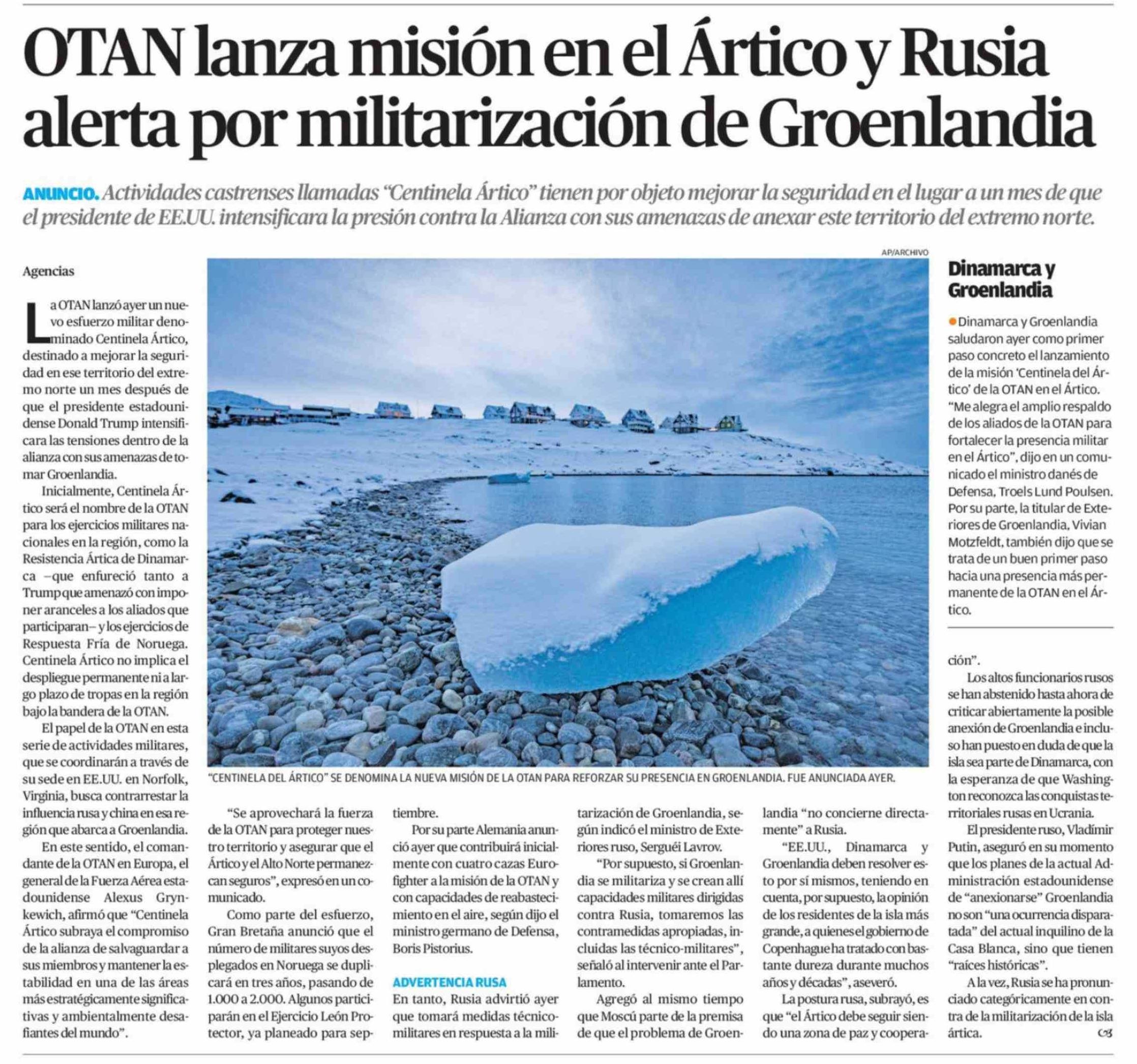 Título: OTAN lanza misión en el Ártico y Rusia alerta por militarización de Groenlandia