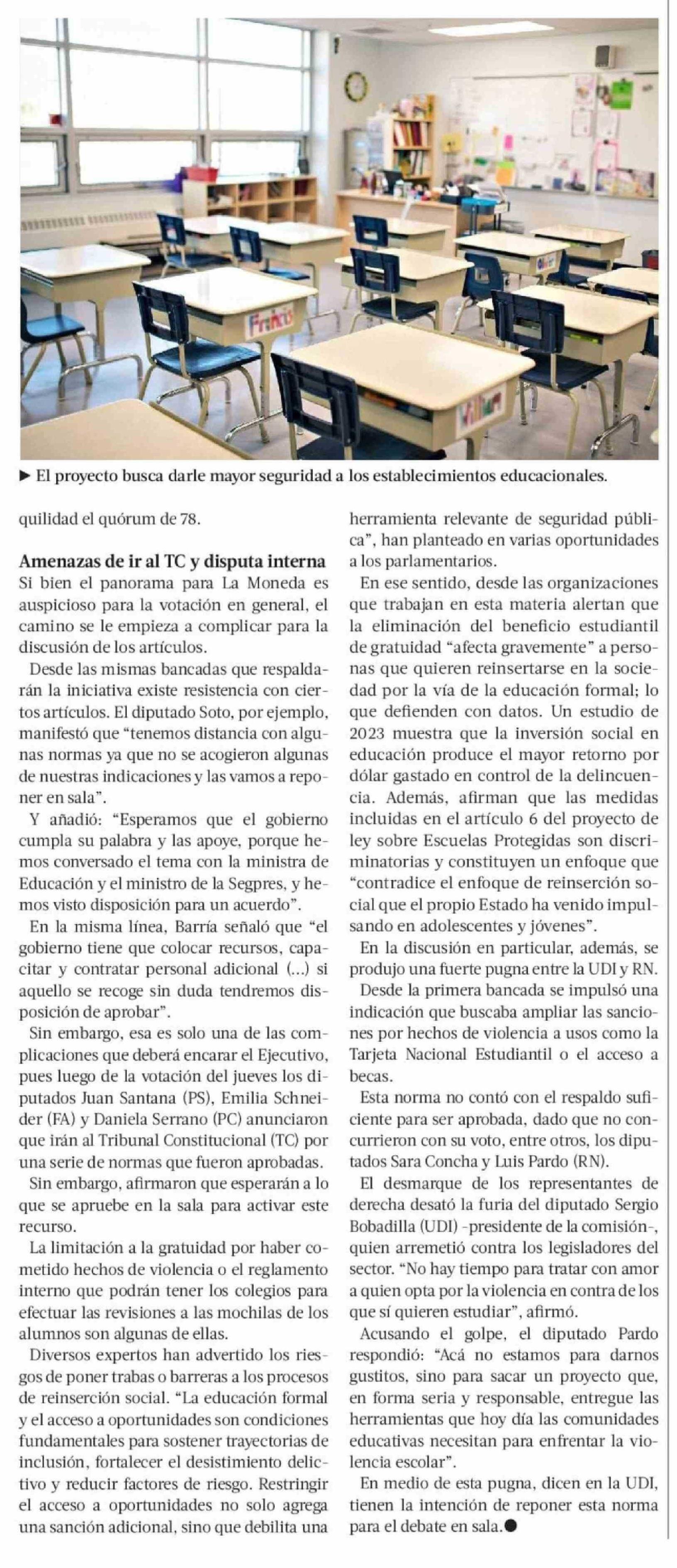 Escuelas Protegidas: gobierno cuenta con los respaldos para aprobarlo en general, pese a pugna entre UDI y RN 20-04-2026 La Tercera |