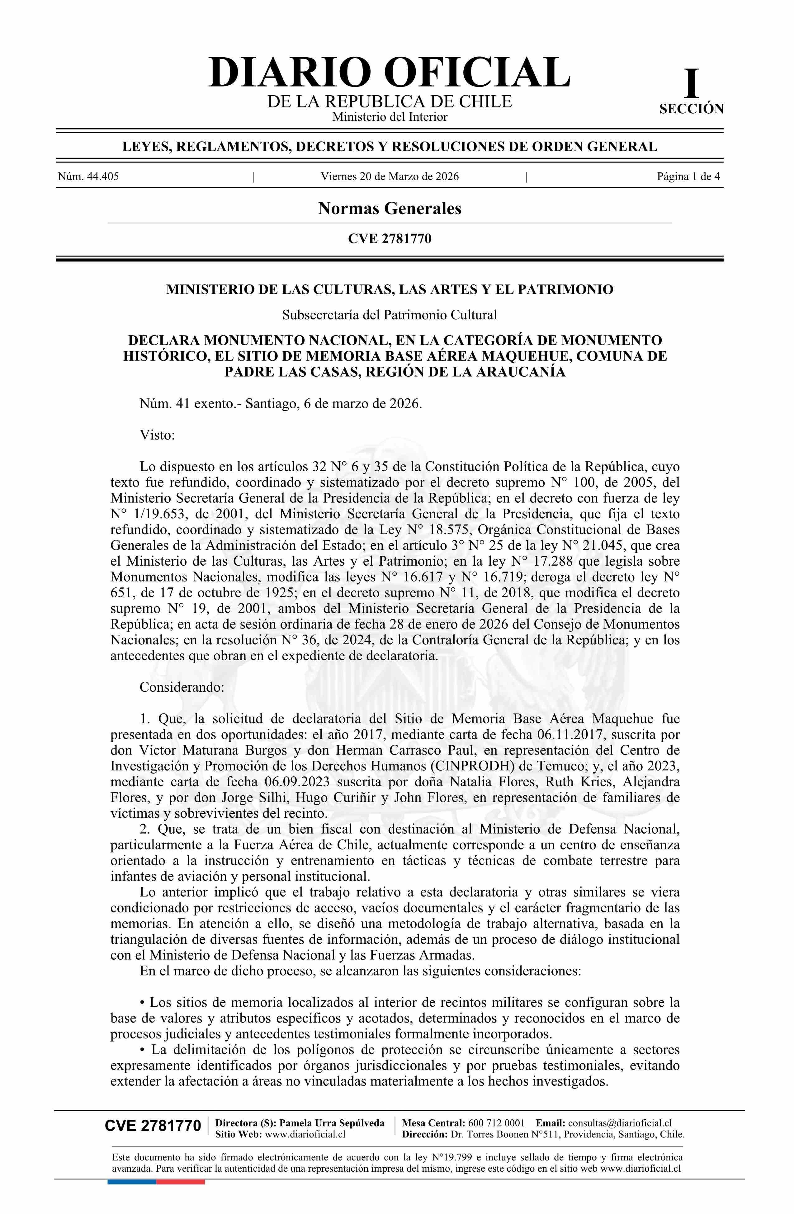Título: Decreto exento número 41, de 2026.- Declara Monumento Nacional, en la categoría de Monumento Histórico, el sitio de Memoria Base Aérea Maquehue, comuna de Padre Las Casas, Región de La Araucanía