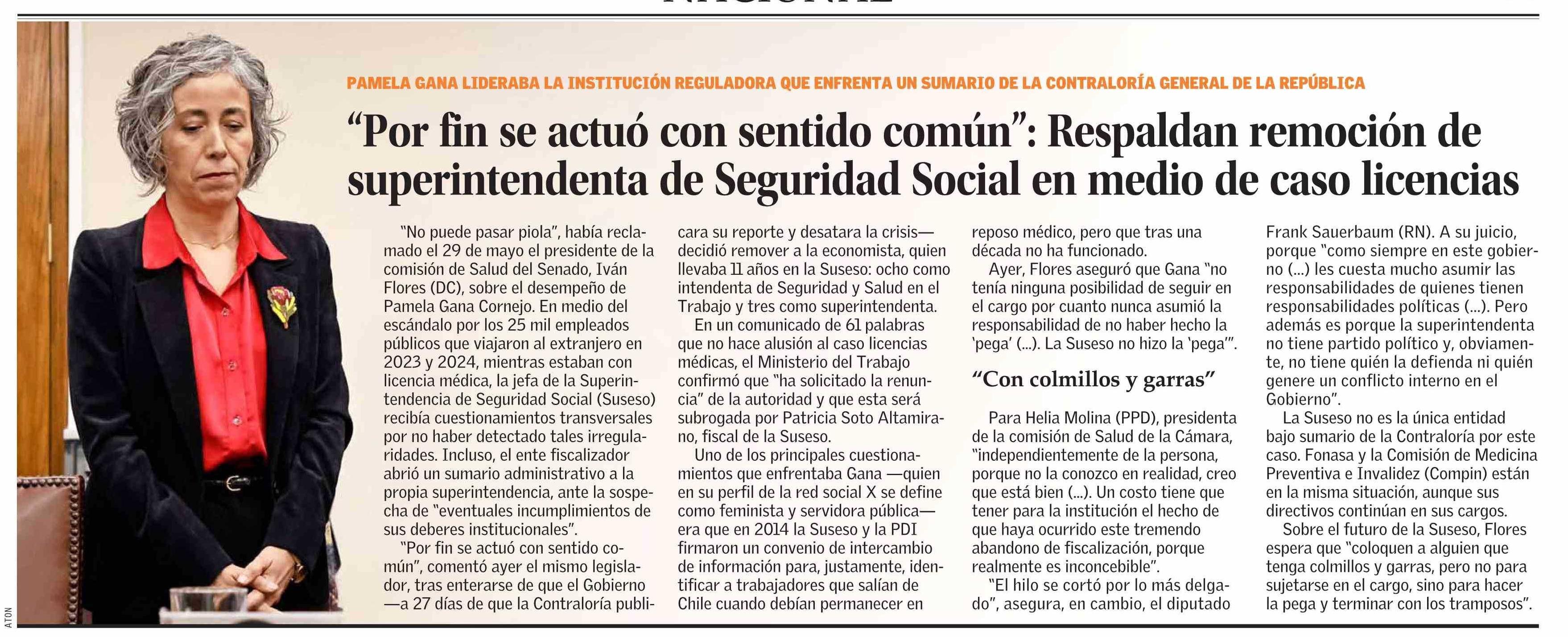 “Por fin se actuó con sentido común”: Respaldan remoción de superintendenta de Seguridad Social en medio de caso licencias 17-06-2025 El Mercurio |