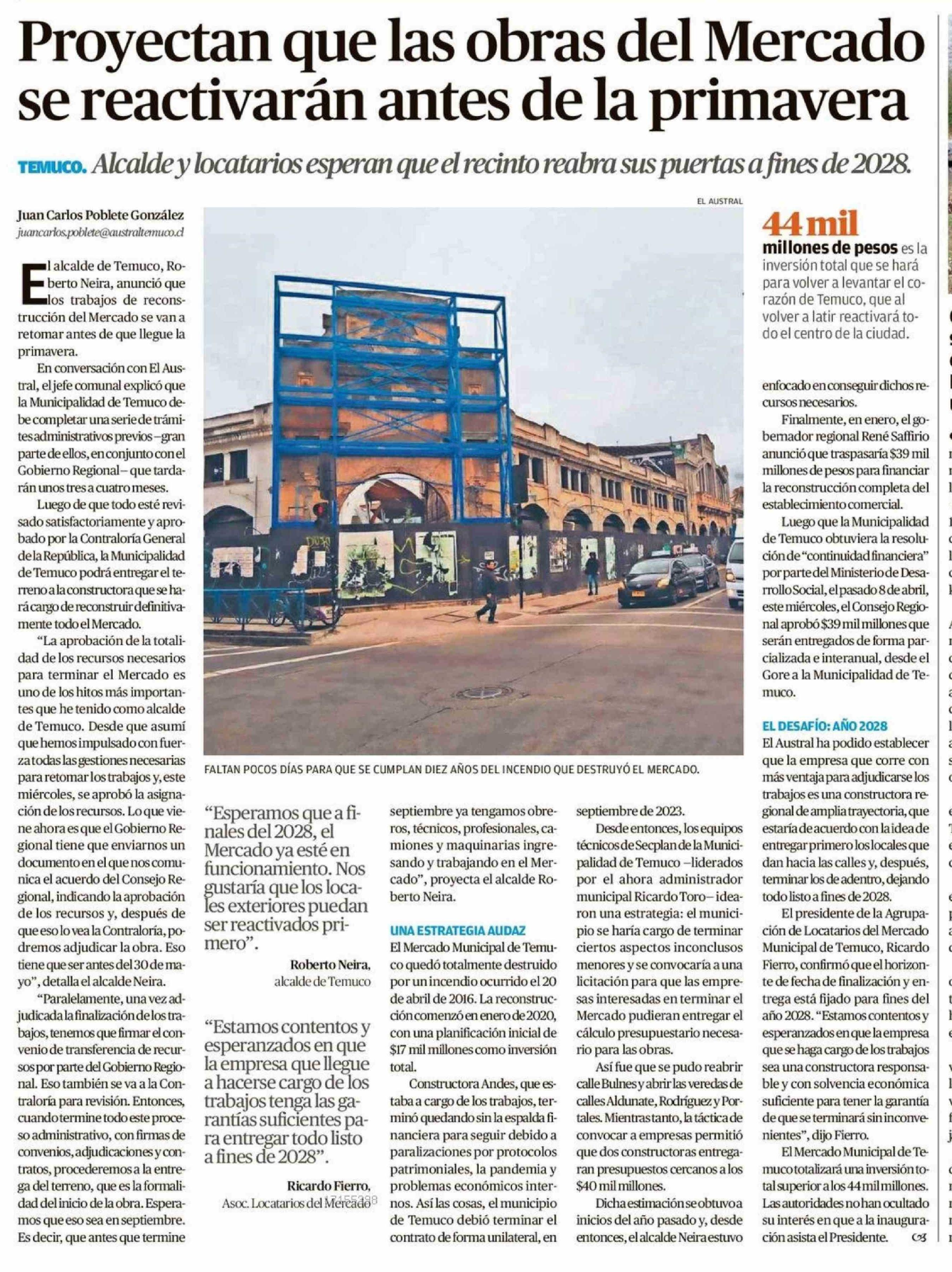 Proyectan que las obras del Mercado se reactivarán antes de la primavera 17-04-2026 El Austral de la Araucanía |