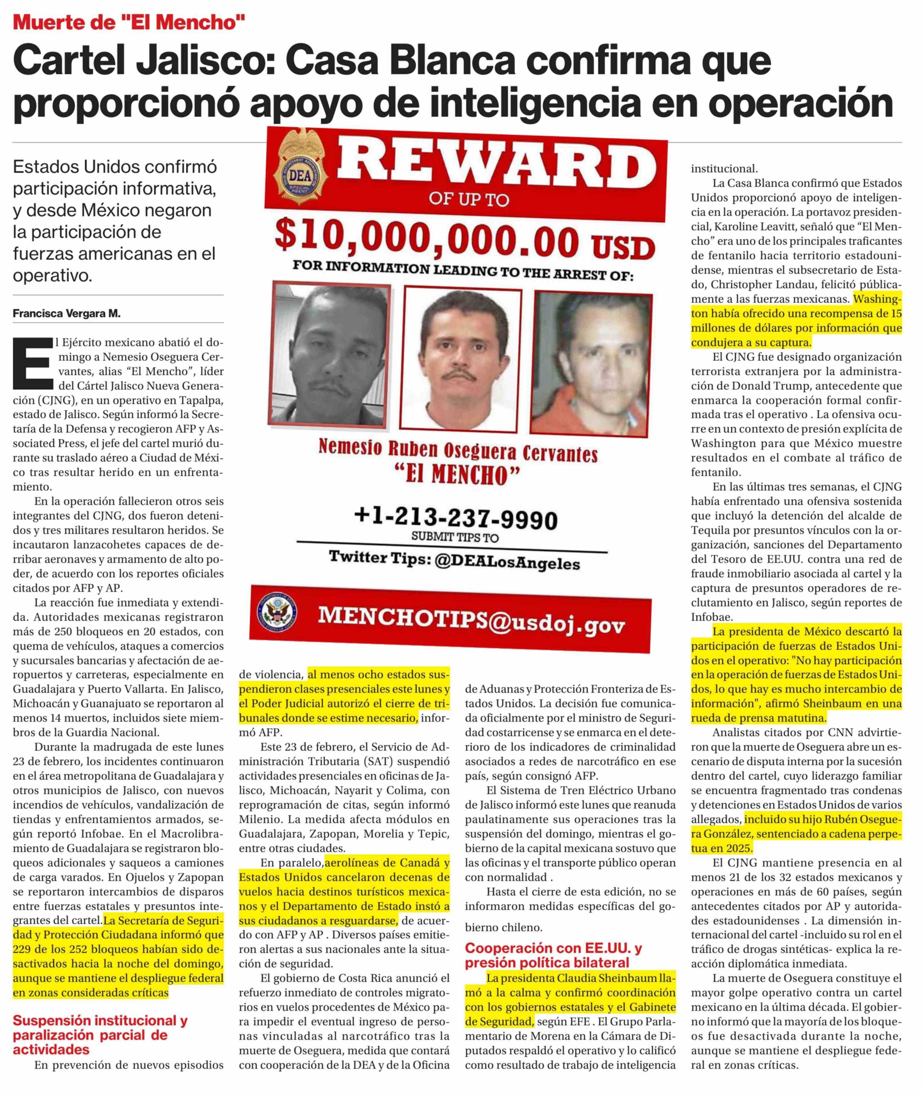 Cartel Jalisco: Casa Blanca confirma que proporcionó apoyo de inteligencia en operación 23-02-2026 La Segunda |