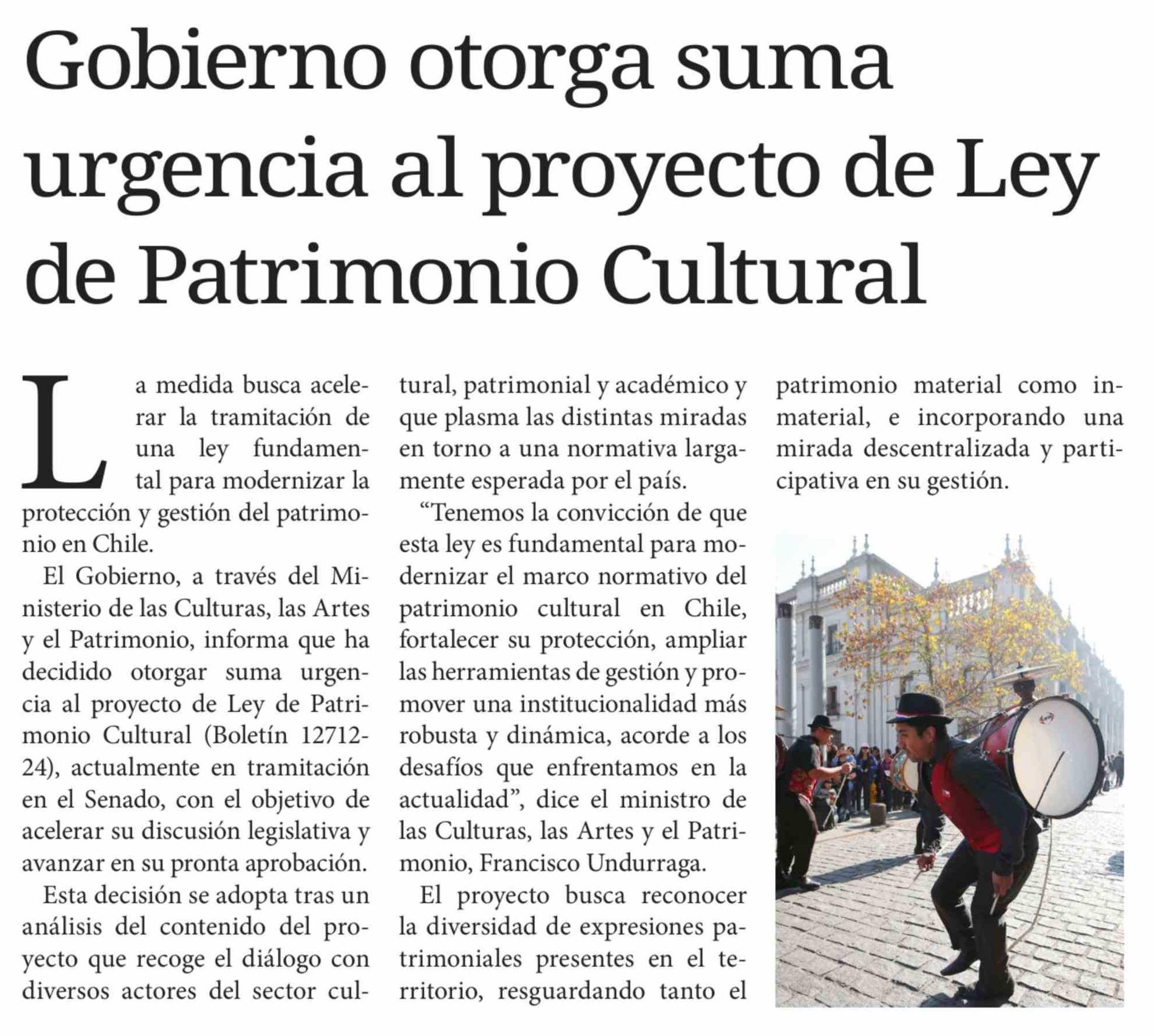 Título: Gobierno otorga suma urgencia al proyecto de Ley de Patrimonio Cultural