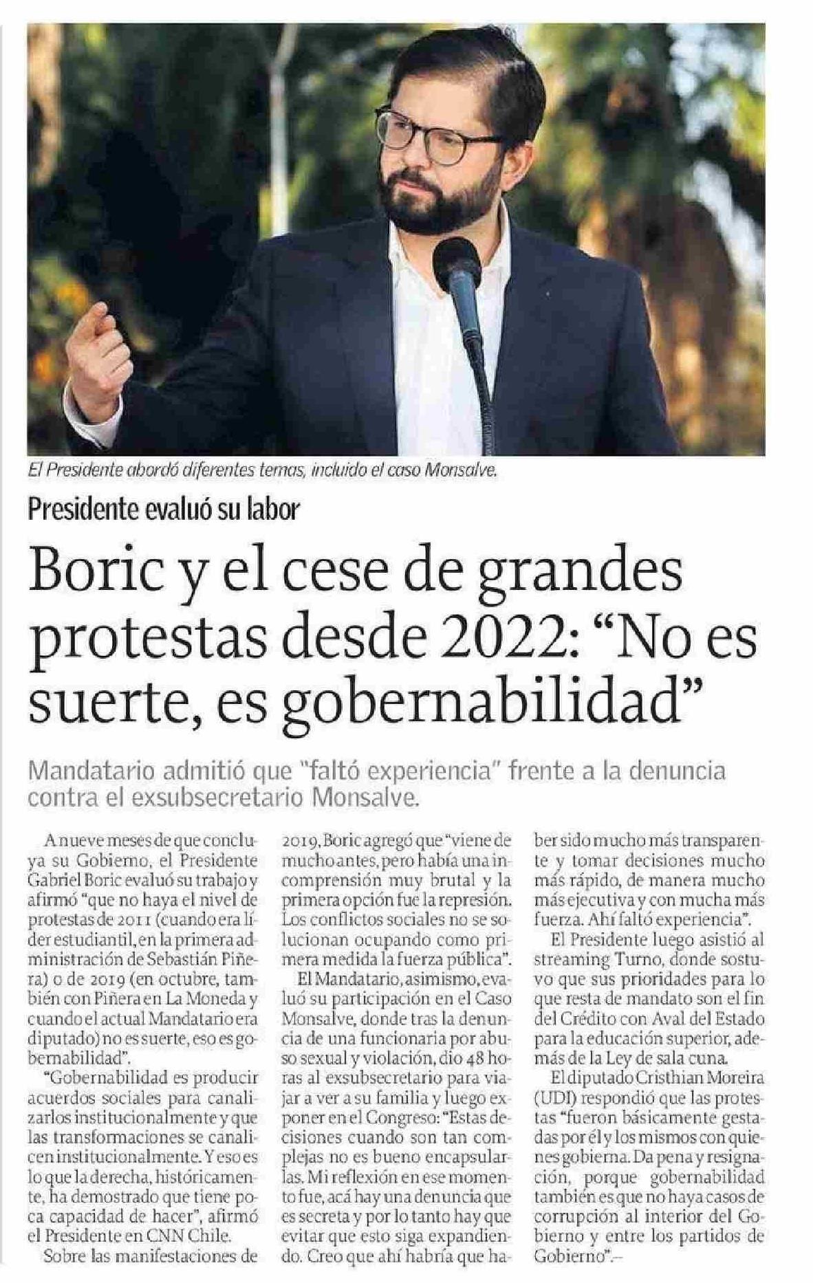 | Título: | Boric y el cese de grandes protestas desde 2022: “No es suerte, es gobernabilidad” |