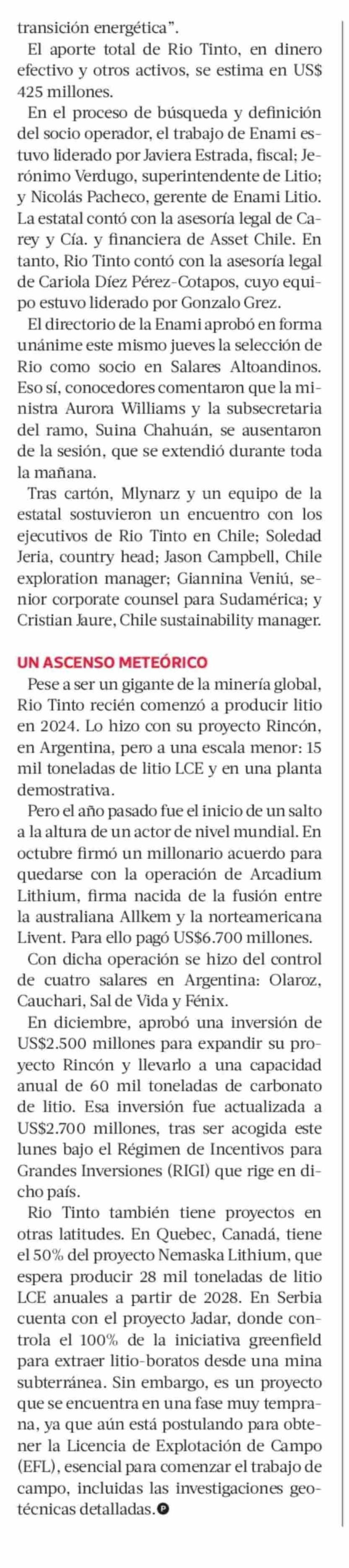 | Título: | Rio Tinto será el tercer actor privado de litio más grande de Chile tras pactar alianzas con Codelco y Enami |