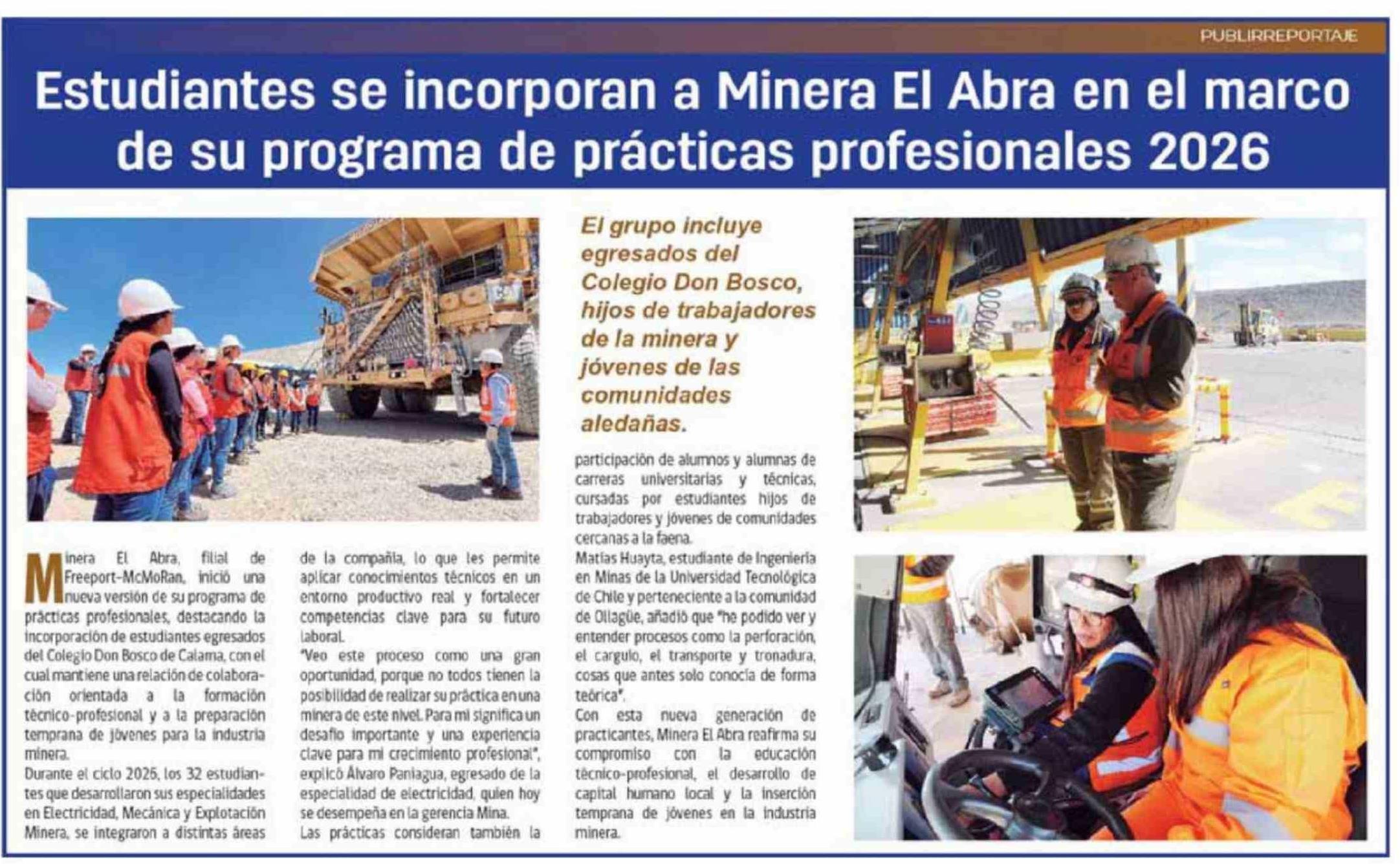 Estudiantes se incorporan a Minera El Abra en el marco de su programa de prácticas profesionales 2026 13-02-2026 El Mercurio de Calama |