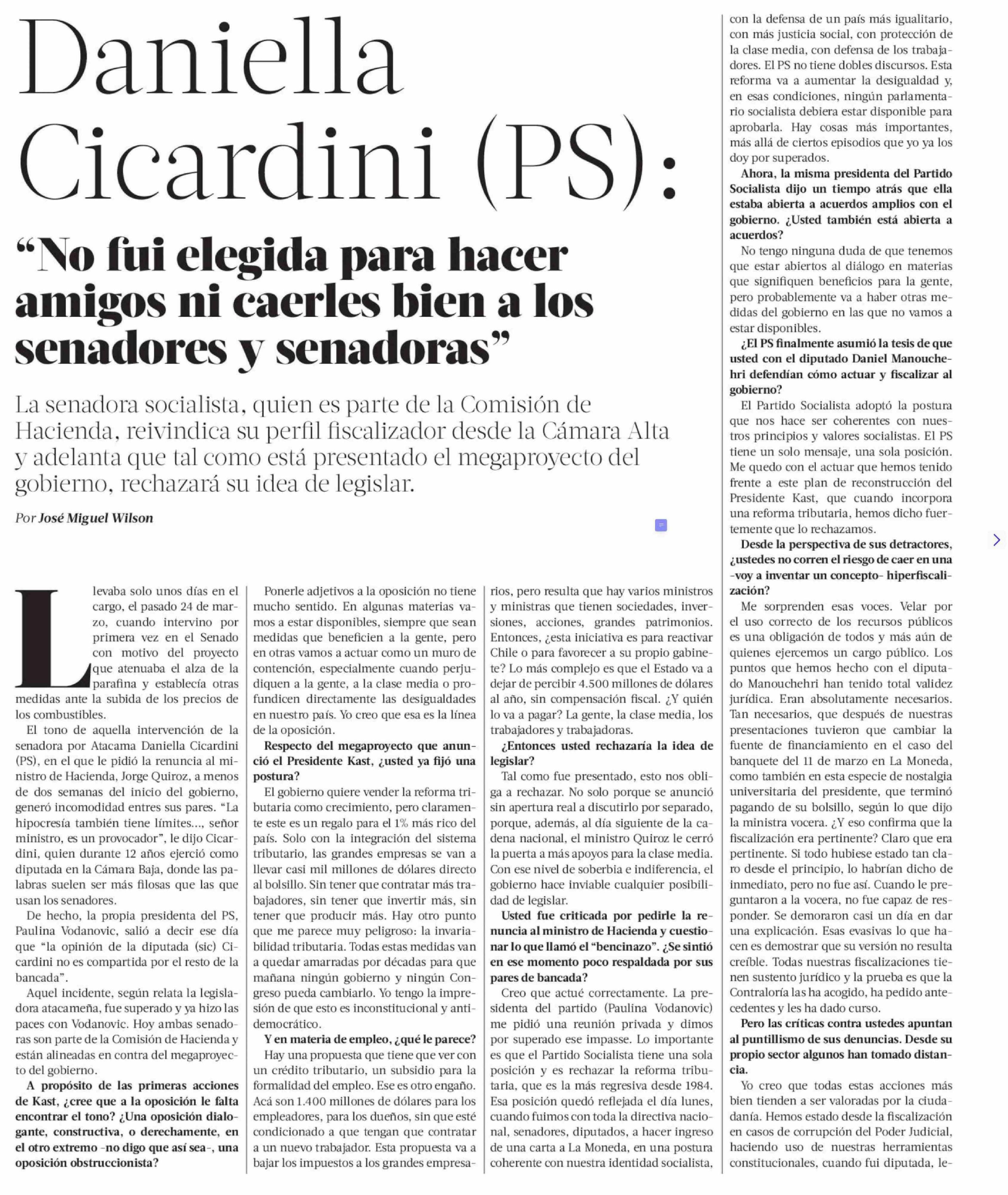 | Título: | Daniella Cicardini (PS): "No fui elegida para hacer amigos ni caerles bien a los senadores y senadoras" |