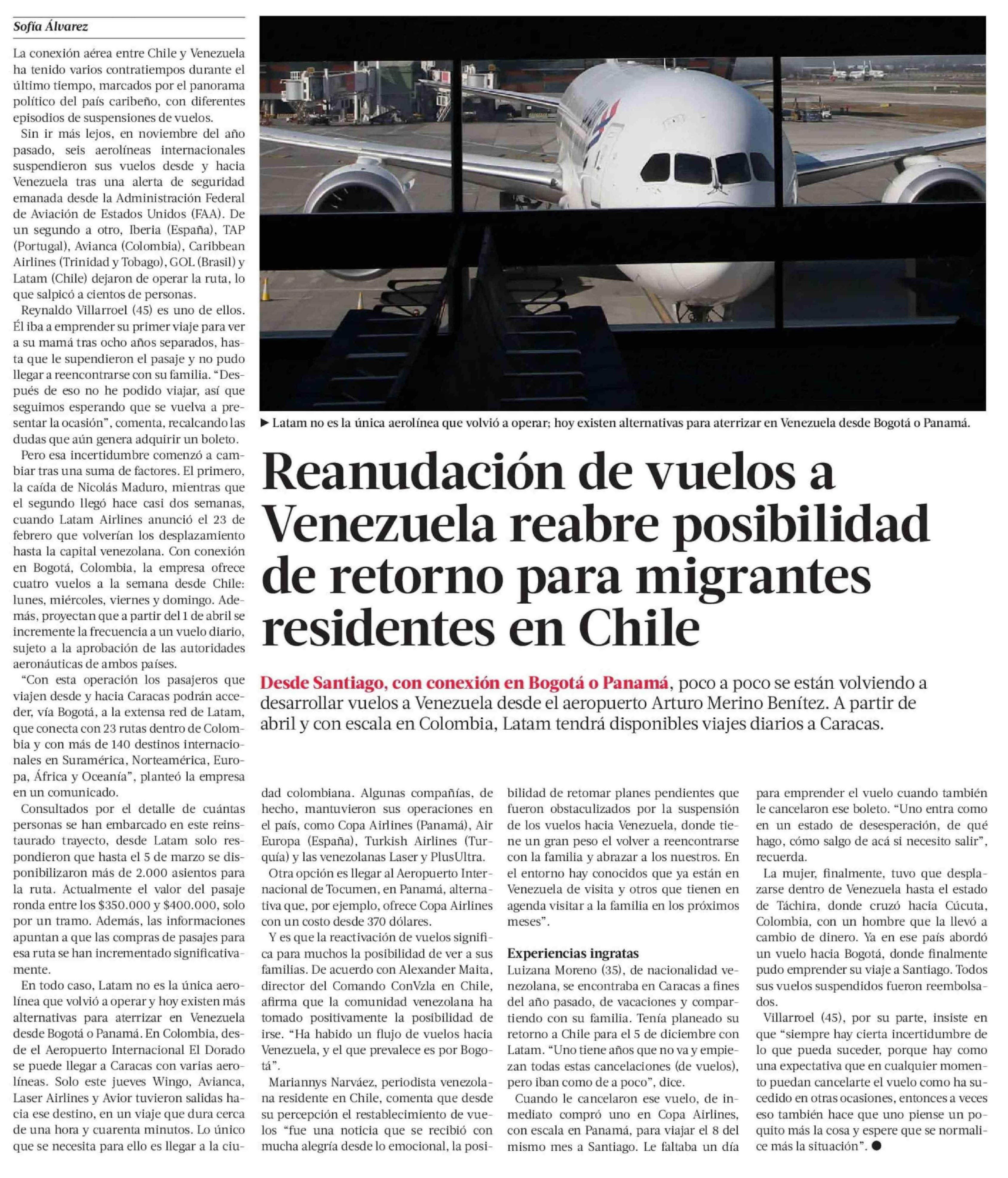 Reanudación de vuelos a Venezuela reabre posibilidad de retorno para migrantes residentes en Chile 06-03-2026 La Tercera |