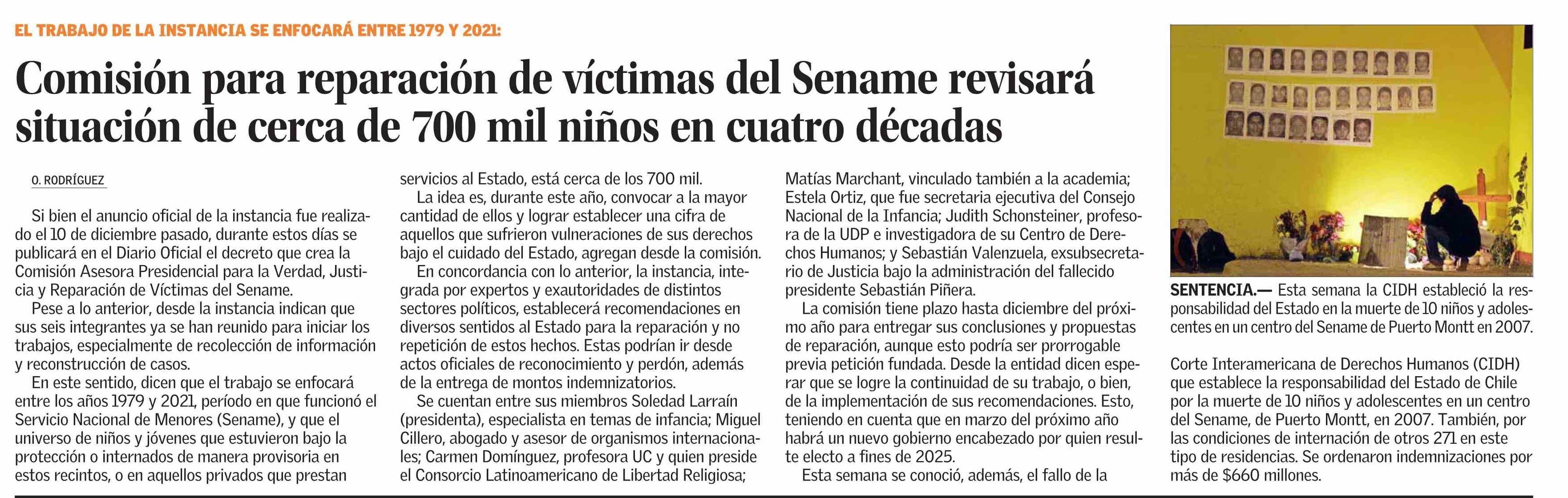 Comisión para reparación de víctimas del Sename revisará situación de cerca de 700 mil niños en cuatro décadas 20-02-2025 El Mercurio |