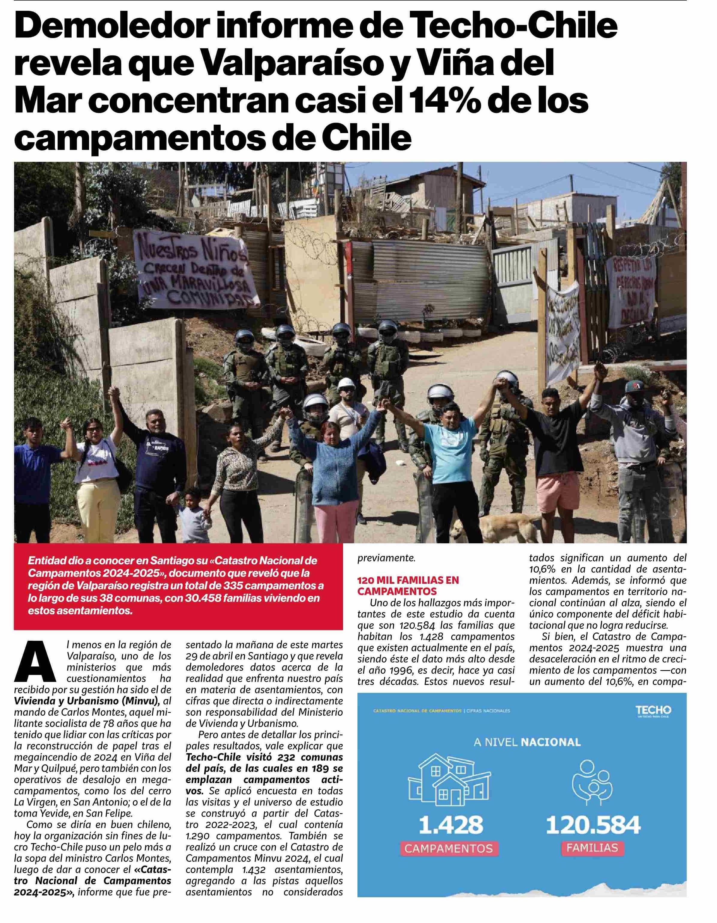 | Título: | Demoledor informe de Techo-Chile revela que Valparaíso y Viña del Mar concentran casi el 14% de los campamentos de Chile |