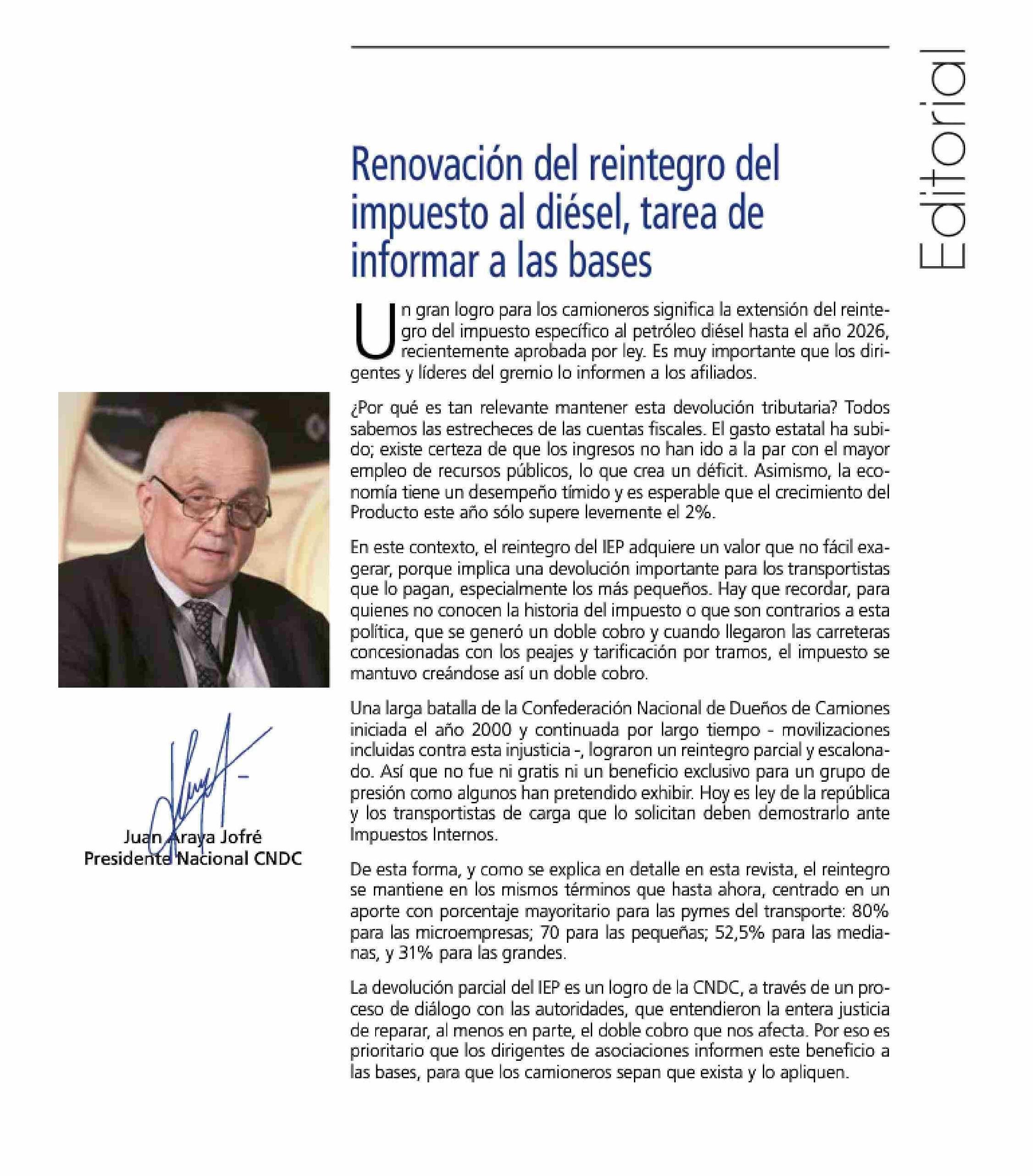 EDITORIAL: Renovación del reintegro del impuesto al diésel, tarea de informar a las bases 17-06-2025 Revista Del Camionero |