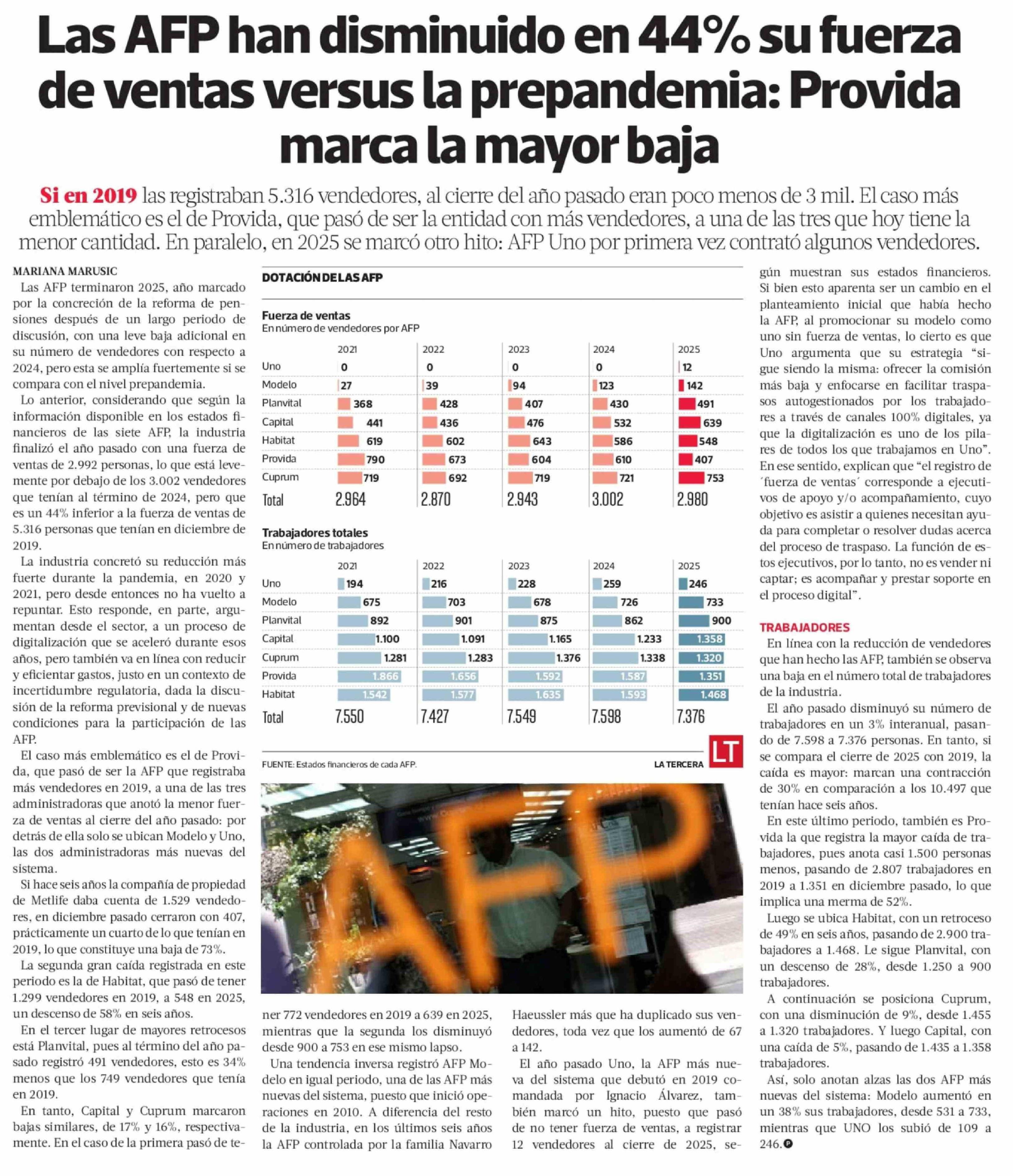 Las AFP han disminuido en 44% su fuerza de ventas versus la prepandemia: Provida marca la mayor baja 06-03-2026 La Tercera |