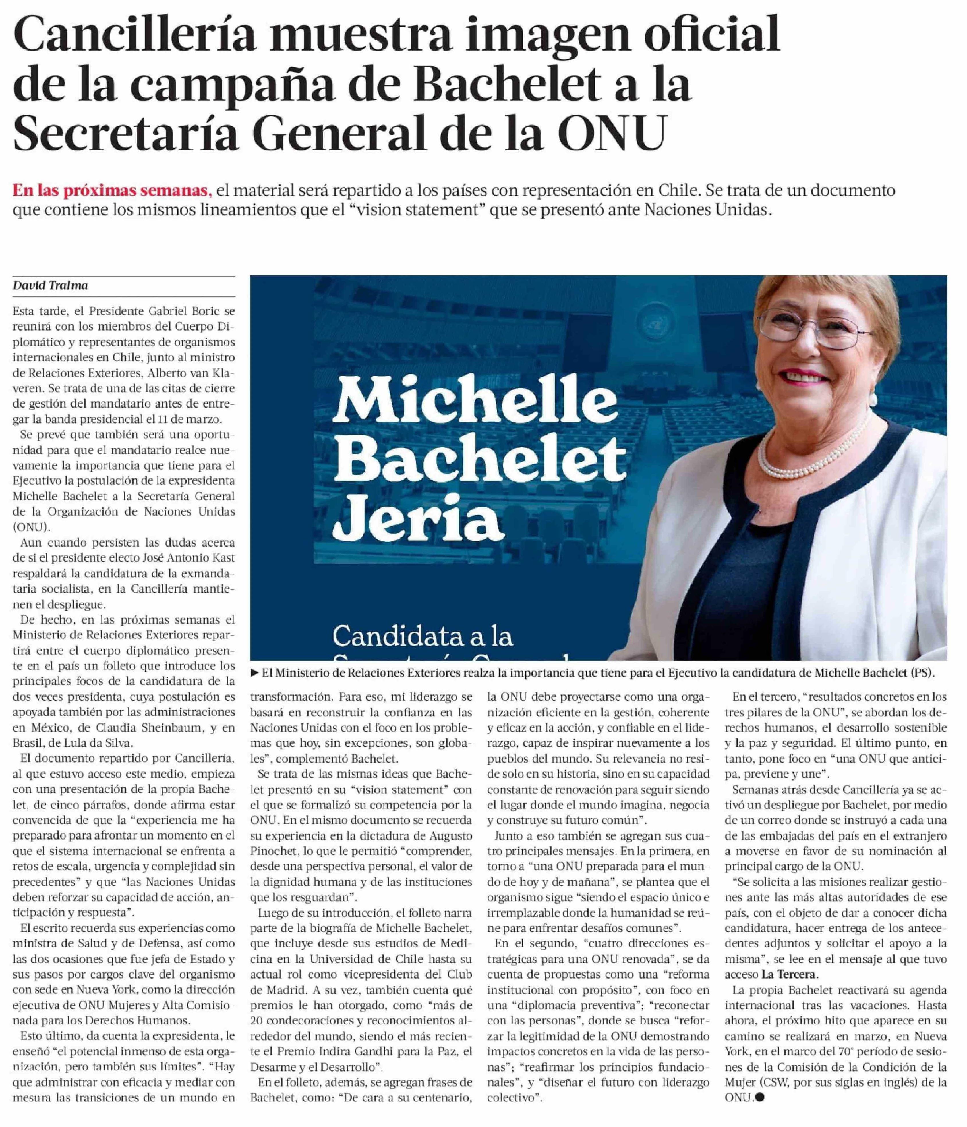 Cancillería muestra imagen oficial de la campaña de Bachelet a la Secretaría General de la ONU 18-02-2026 La Tercera |