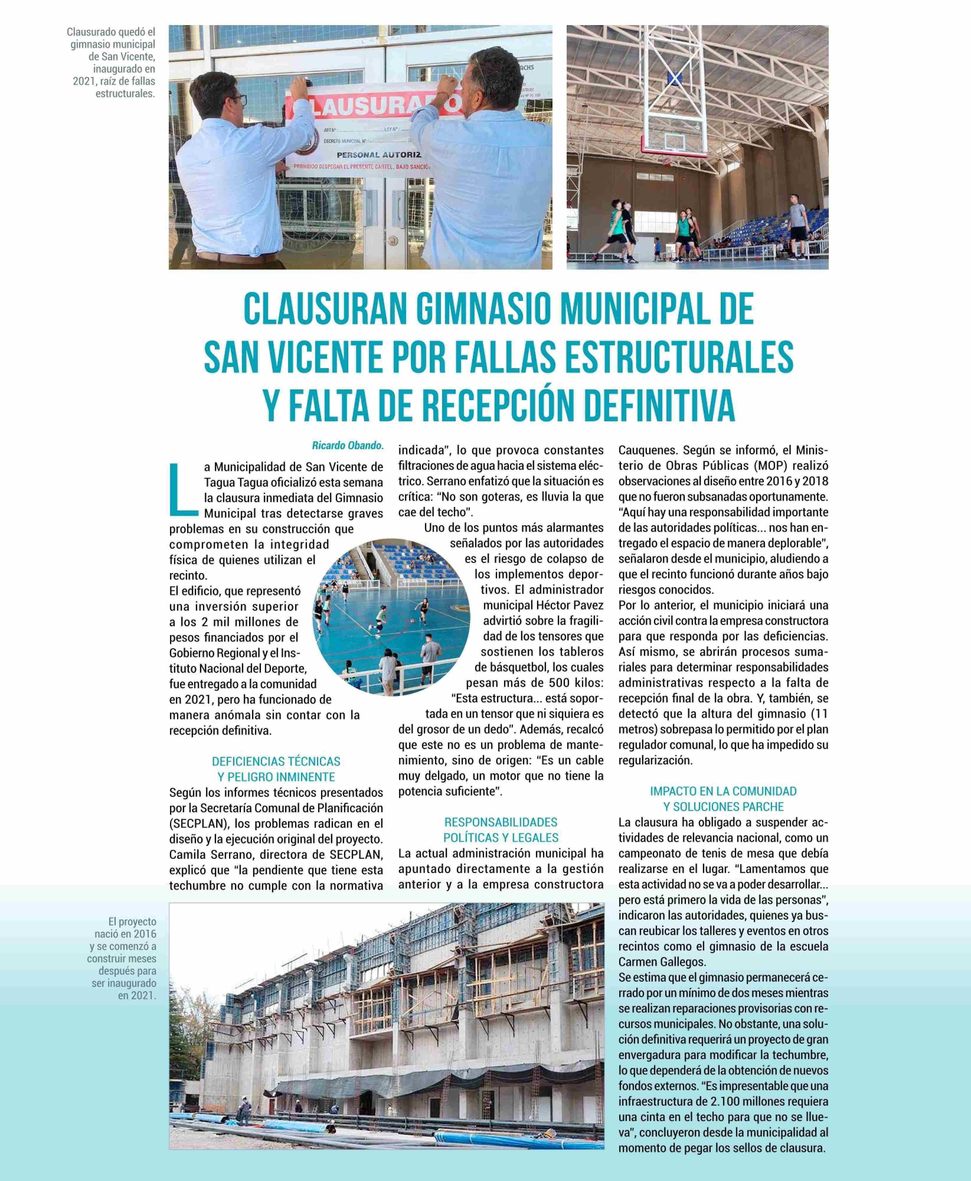 CLAUSURAN GIMNASIO MUNICIPAL DE SAN VICENTE POR FALLAS ESTRUCTURALES Y FALTA DE RECEPCIÓN DEFINITIVA 11-04-2026 El Rancagüino |