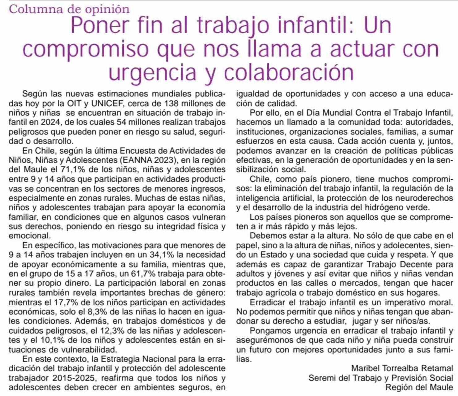 COLUMNAS DE OPINIÓN: Poner fin al trabajo infantil: Un compromiso que nos llama a actuar con urgencia y colaboración 13-06-2025 Maule Hoy |