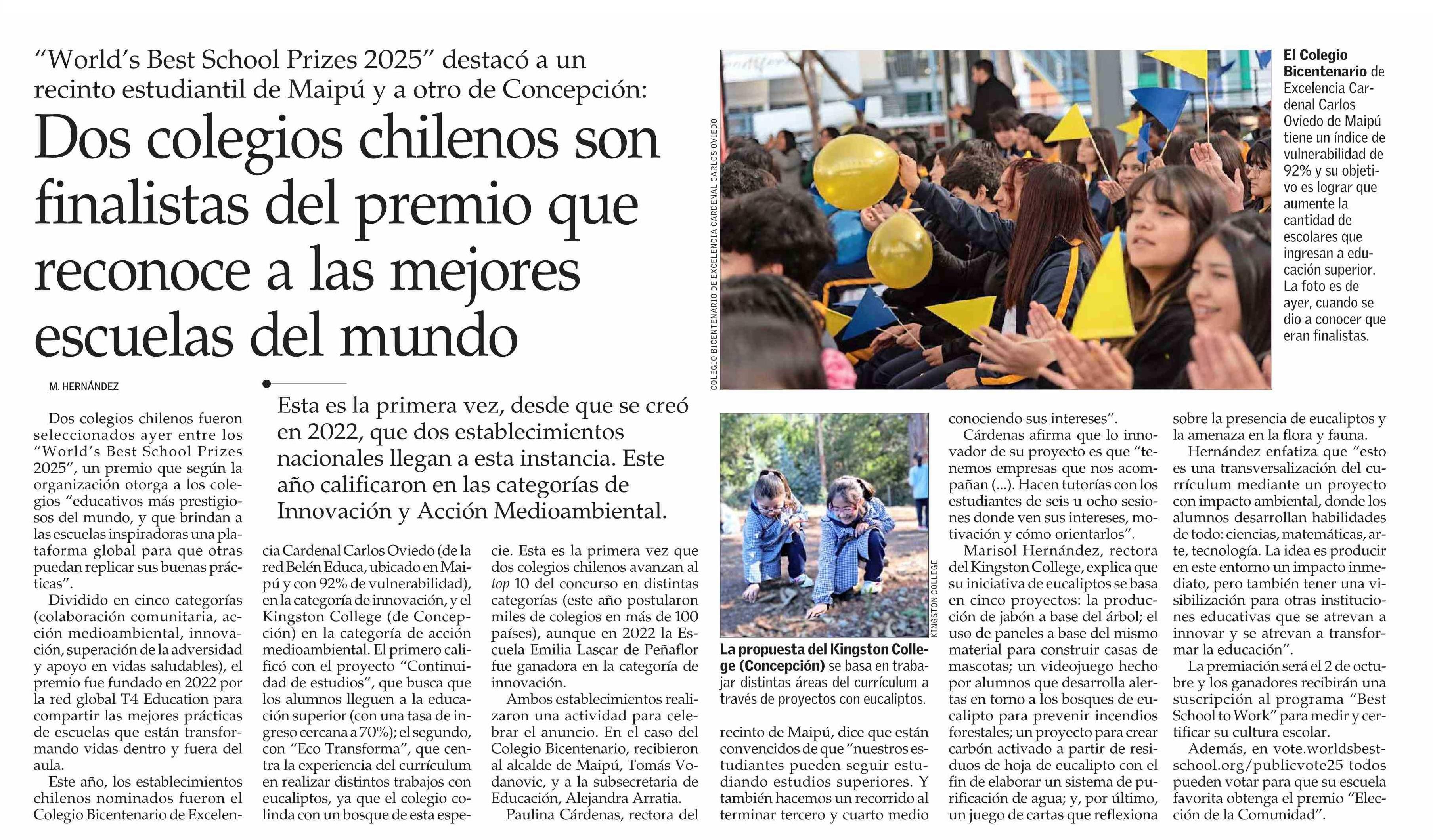 Dos colegios chilenos son finalistas del premio que reconoce a las mejores escuelas del mundo 19-06-2025 El Mercurio |
