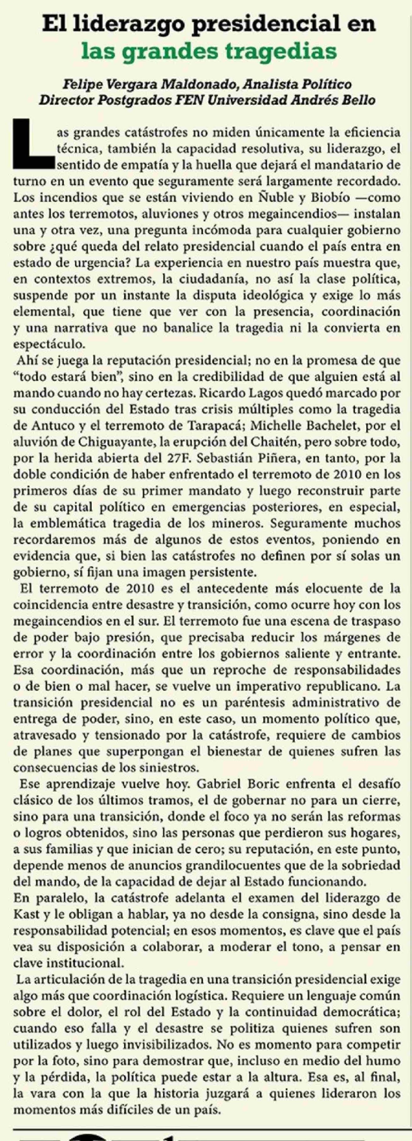 Columnas de Opinión: El liderazgo presidencial en las grandes tragedias 20-01-2026 El Heraldo Austral |