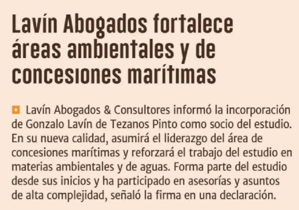 Lavín Abogados fortalece áreas ambientales y de concesiones marítimas 10-04-2026 Diario Financiero |