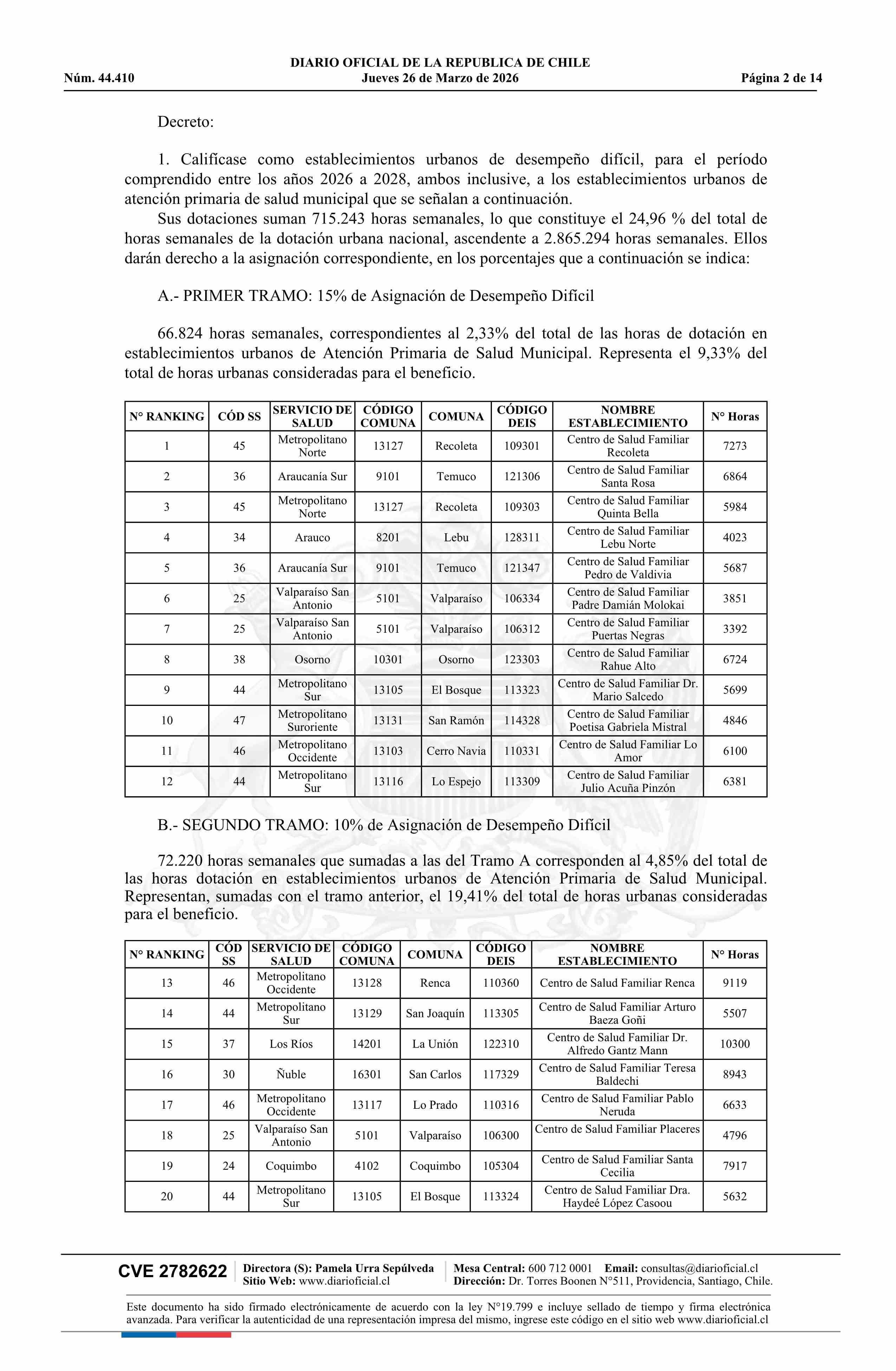 Decreto número 29, de 2025.- Fija establecimientos urbanos de desempeño difícil de Atención Primaria de Salud, periodo 2026 a 2028