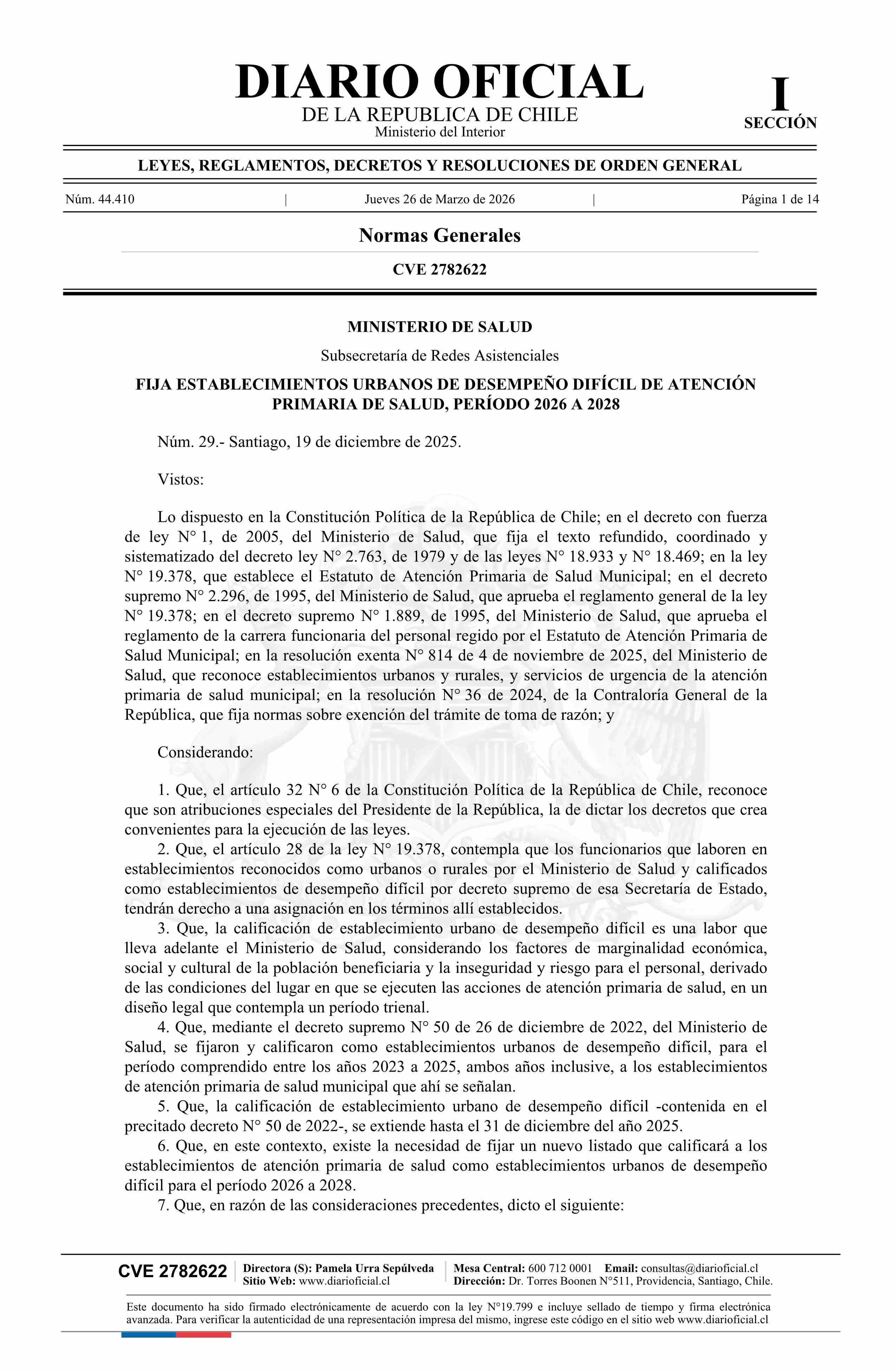 Título: Decreto número 29, de 2025.- Fija establecimientos urbanos de desempeño difícil de Atención Primaria de Salud, periodo 2026 a 2028