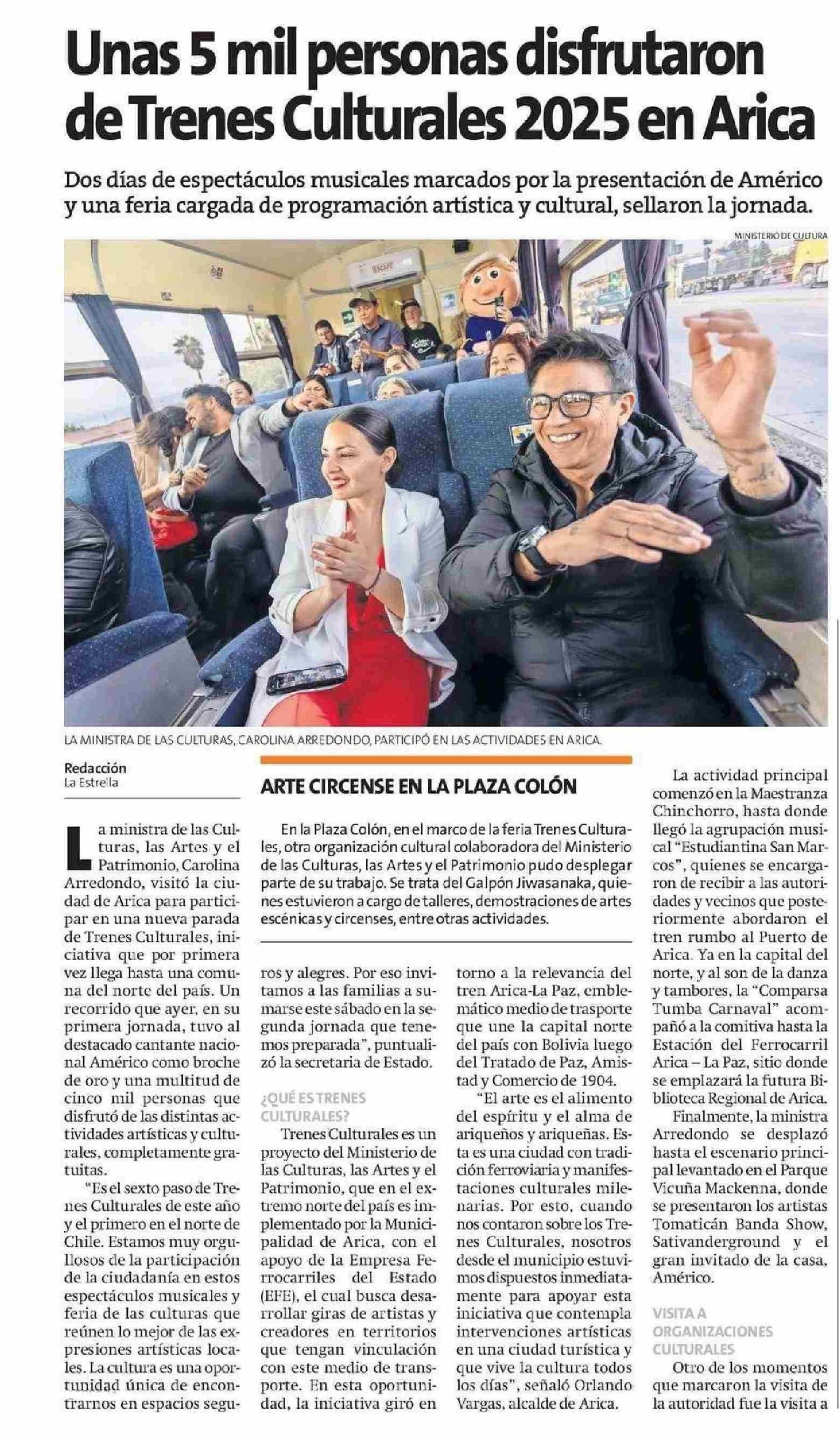 Unas 5 mil personas disfrutaron de Trenes Culturales 2025 en Arica 01-06-2025 La Estrella de Arica |