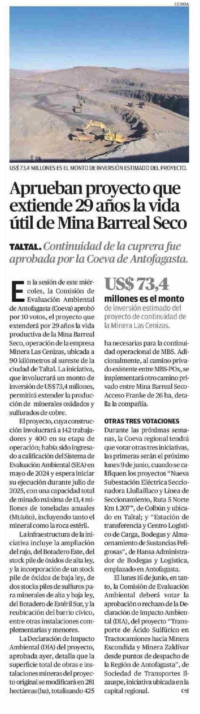 Aprueban proyecto que extiende 29 años la vida útil de Mina Barreal Seco 05-06-2025 El Mercurio de Antofagasta |