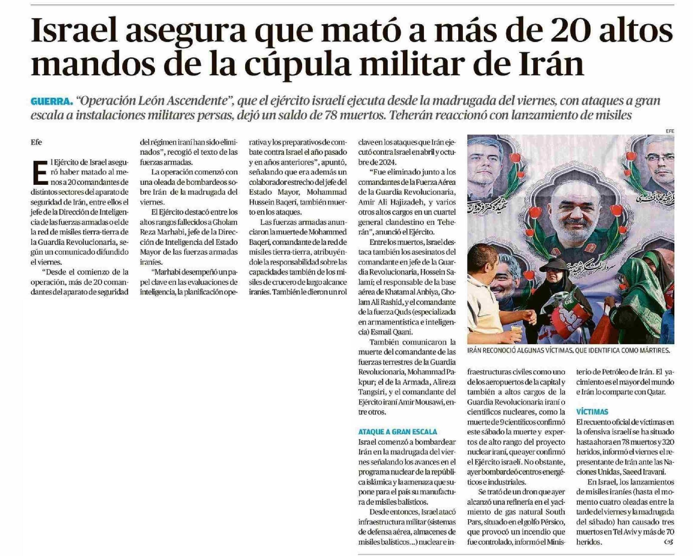 Israel asegura que mató a más de 20 altos mandos de la cúpula militar de Irán 15-06-2025 El Mercurio de Valparaíso |