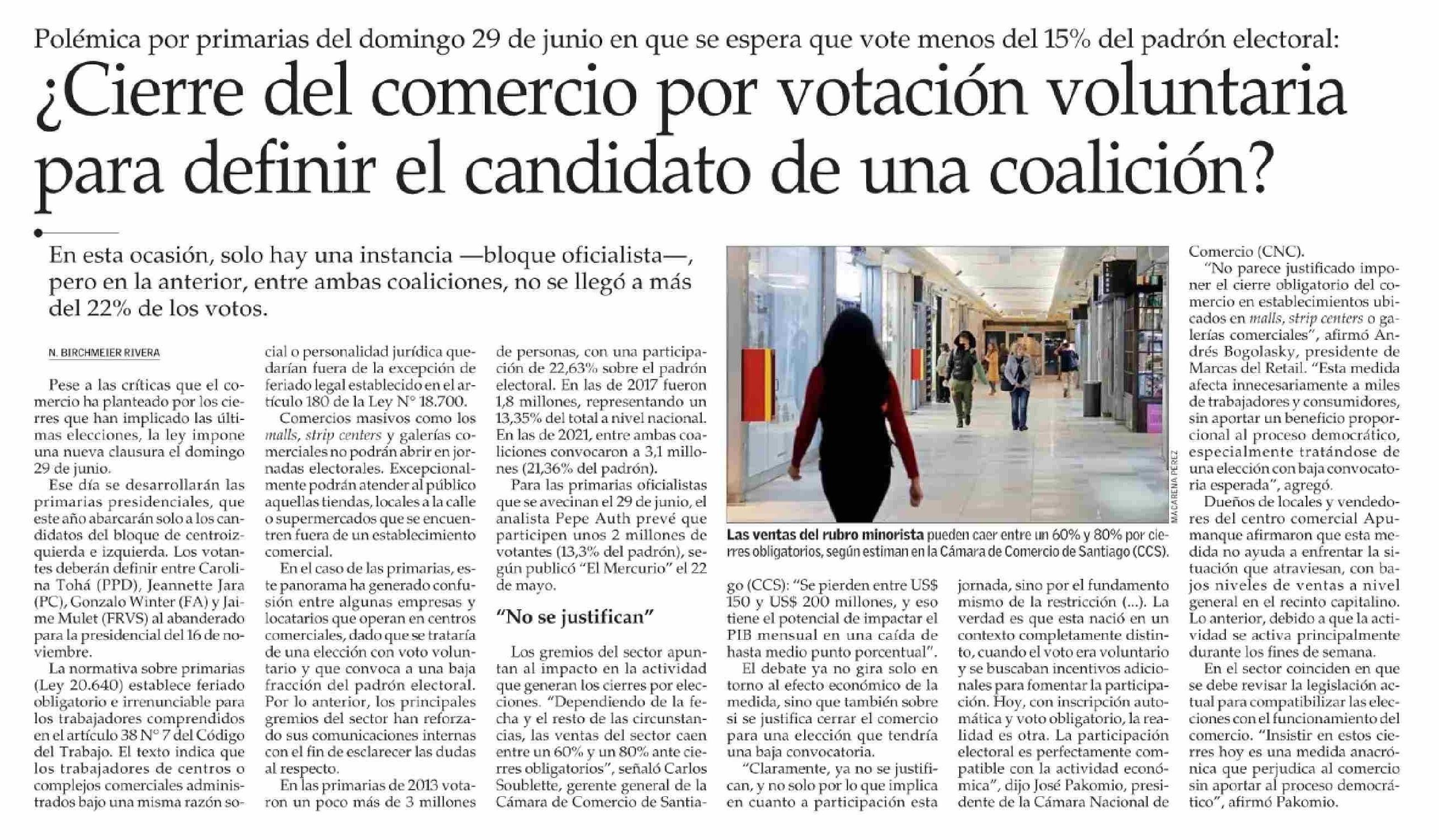 ¿Cierre del comercio por votación voluntaria para definir el candidato de una coalición? 03-06-2025 El Mercurio |