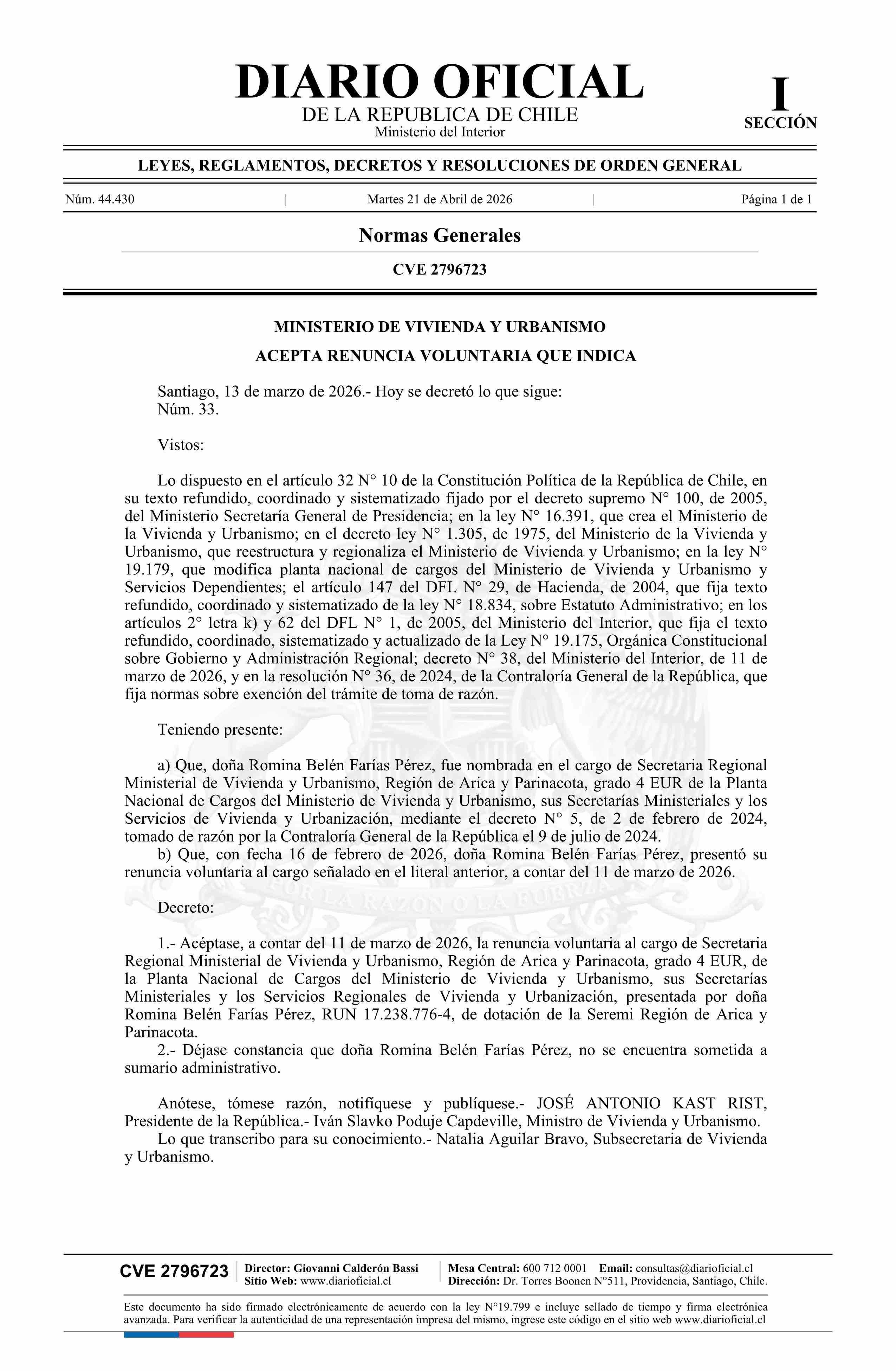 | Título: | Decreto número 33, de 2026.- Acepta renuncia voluntaria de doña Romina Belén Farías Pérez al cargo de Secretaria Regional Ministerial de Vivienda y Urbanismo Región de Arica y Parinacota |