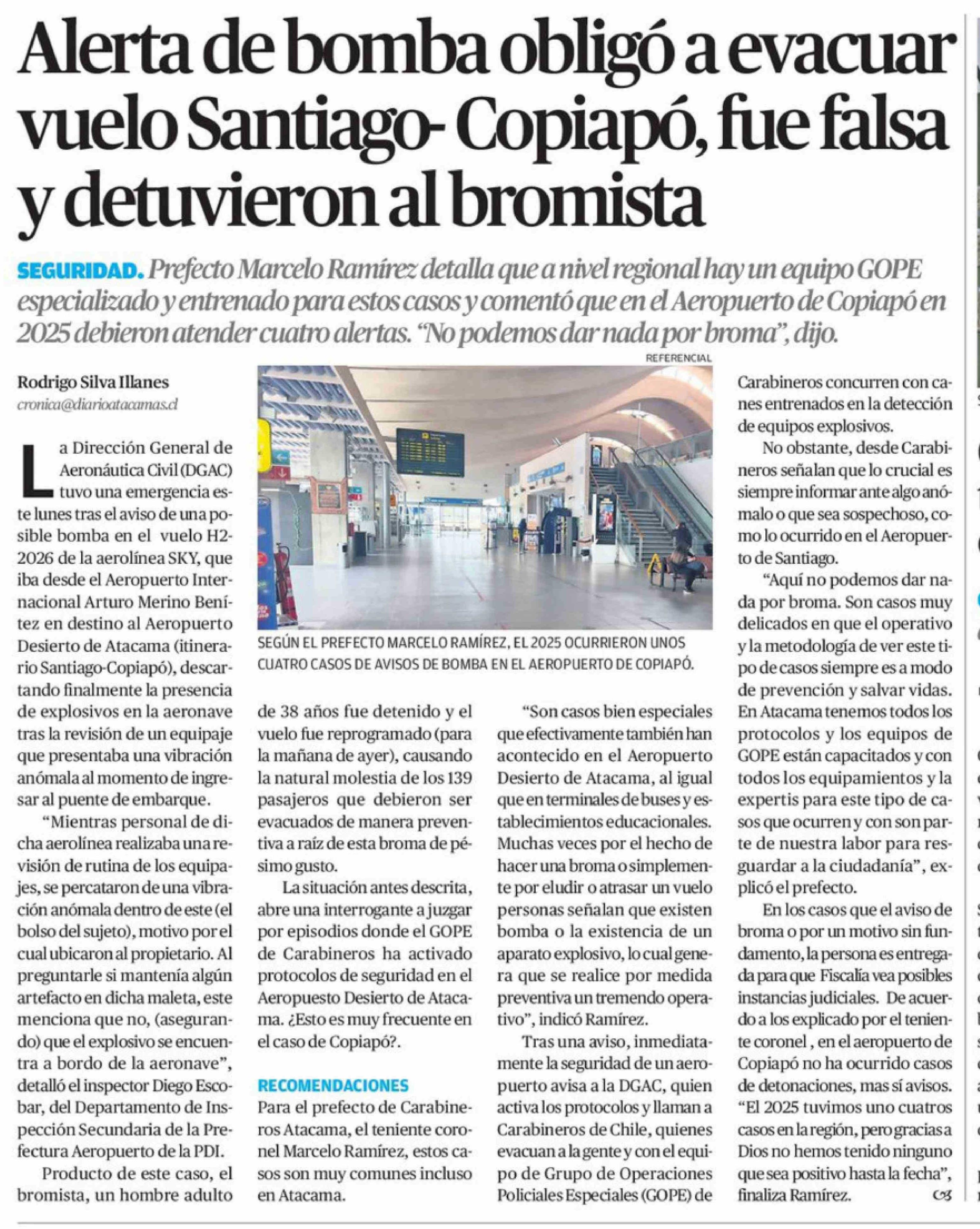Alerta de bomba obligó a evacuar vuelo Santiago- Copiapó, fue falsa y detuvieron al bromista 11-02-2026 El Diario de Atacama |