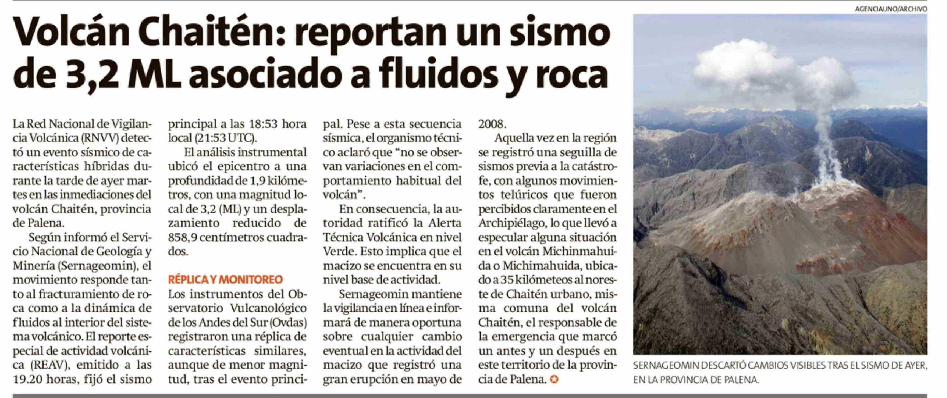 | Título: | Volcán Chaitén: reportan un sismo de 3,2 ML asociado a fluidos y roca |